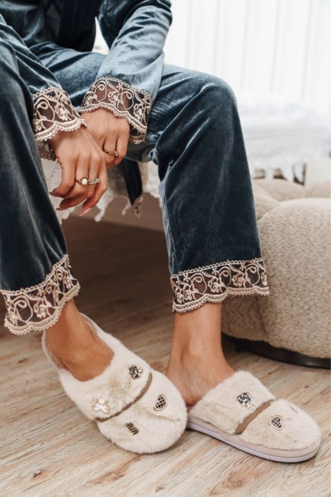 Γυναικείες γούνινες παντόφλες σπιτιού με απαλή επένδυση και διακοσμητικά στοιχεία, που χαρίζουν ξεχωριστή αισθητική. Η εσωτερική τους φόδρα είναι μαλακή και ζεστή, εξασφαλίζοντας άνετη εφαρμογή σε κάθε χρήση. Η σόλα είναι αντιολισθητική και ελαφριά, προσφέροντας σταθερότητα σε εσωτερικούς χώρους. Ο slip-on σχεδιασμός επιτρέπει εύκολη και γρήγορη εφαρμογή, ενώ οι λεπτομέρειες με charms και μοτίβα δίνουν κομψό χαρακτήρα. Μια πρακτική επιλογή που συνδυάζει ζεστασιά και στυλ στην καθημερινή χρήση. Συνδυάστε τις γούνινες παντόφλες με fleece σετ φόρμας ή ένα μάλλινο ζακετάκι για να απολαμβάνετε απόλυτη ζεστασιά και κομψότητα στο σπίτι.