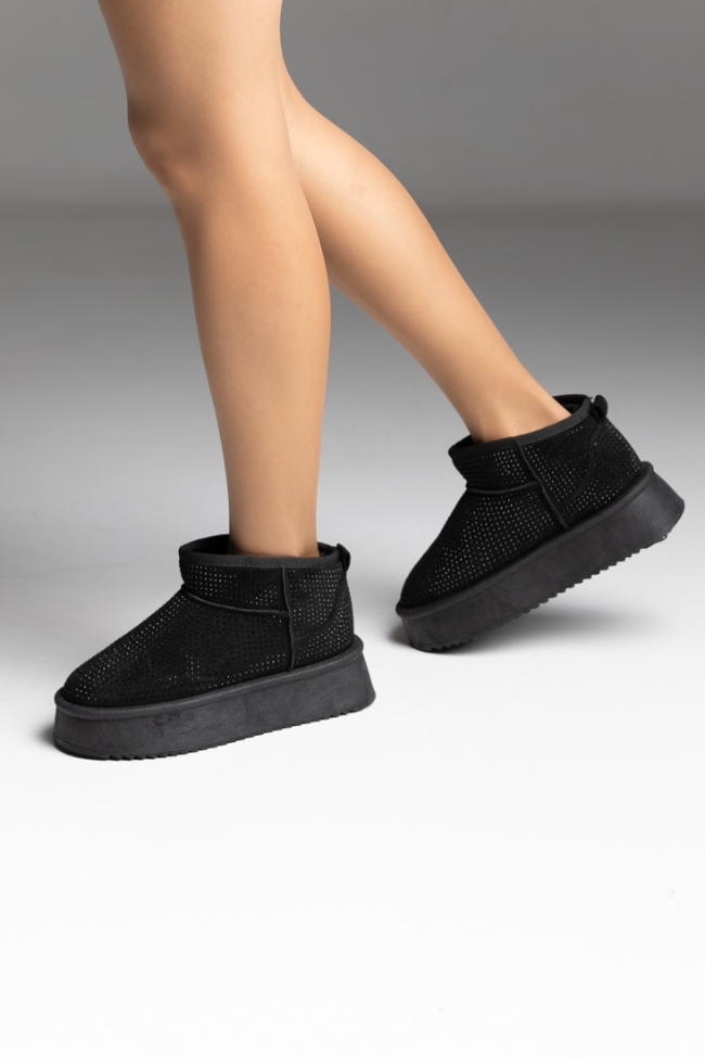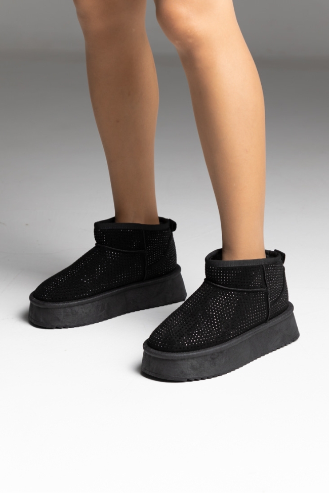 Γυναικεία μποτάκια με εσωτερική επένδυση γούνας και διακοσμητικά strass – Μαύρο