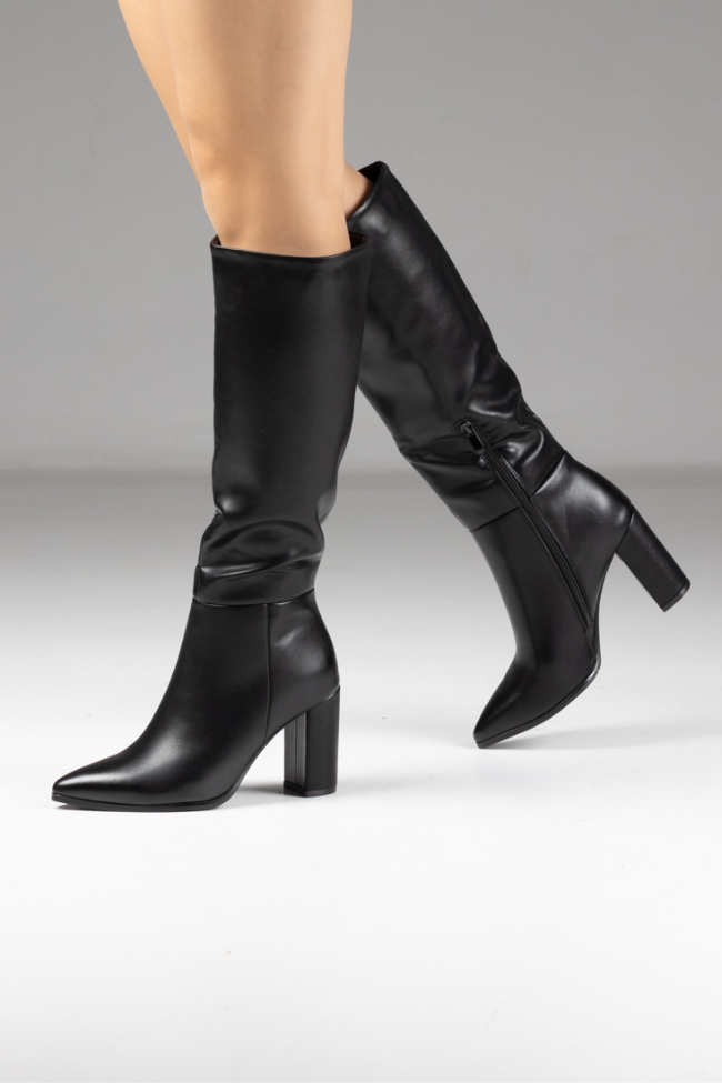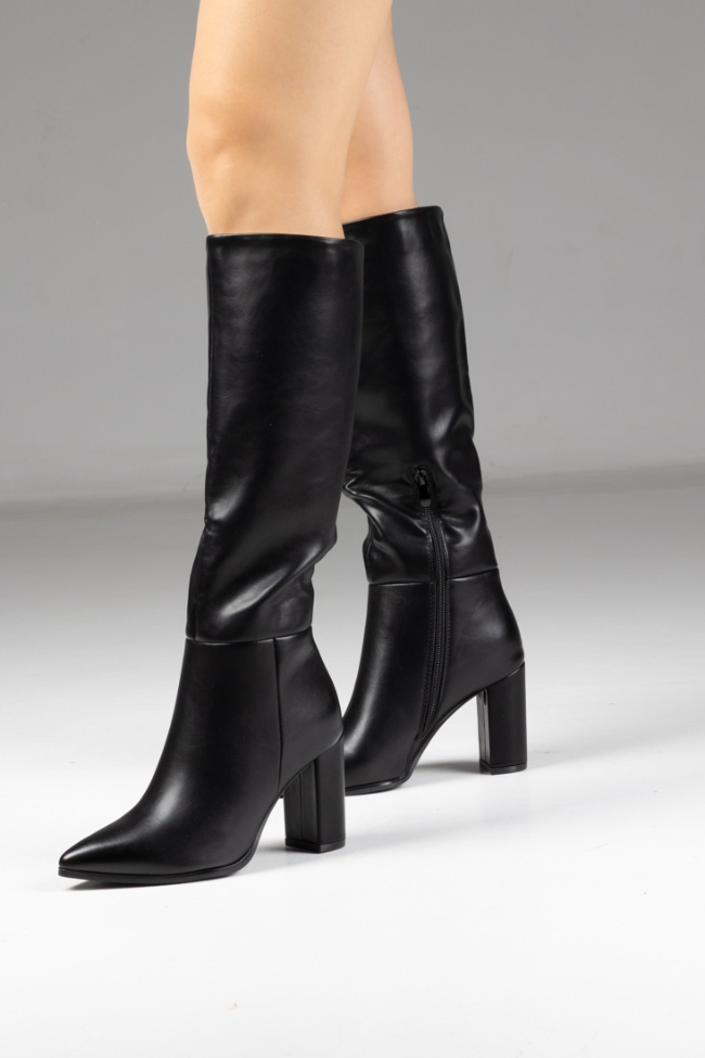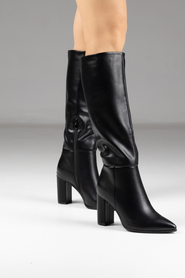 Γυναικεία μπότα δερματίνη με χοντρό τακούνι – Μαύρο