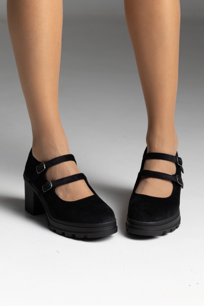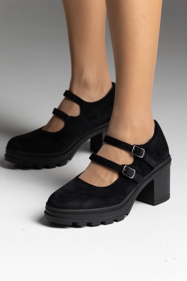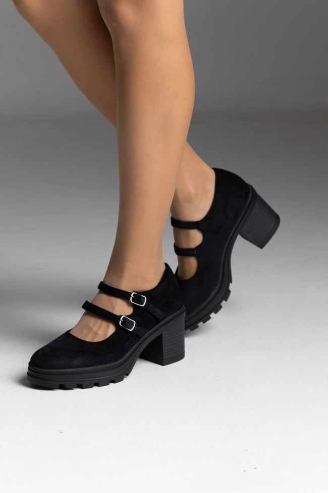 Γυναικείες γόβες σε χρώμα μαύρο, suede με χοντρό τακούνι καουτσούκ και διπλό λουράκι.Ανανεώστε τη συλλογή σας με αυτές τις κομψές γόβες, ιδανικές για κάθε περίσταση. Διπλά λουράκια προσφέρουν στήριξη και άνεση, ενώ η φινετσάτη σχεδίαση εξασφαλίζει στυλ και αυτοπεποίθηση. Αποκτήστε αυτό το must-have κομμάτι και μαγνητίστε τα βλέμματα.