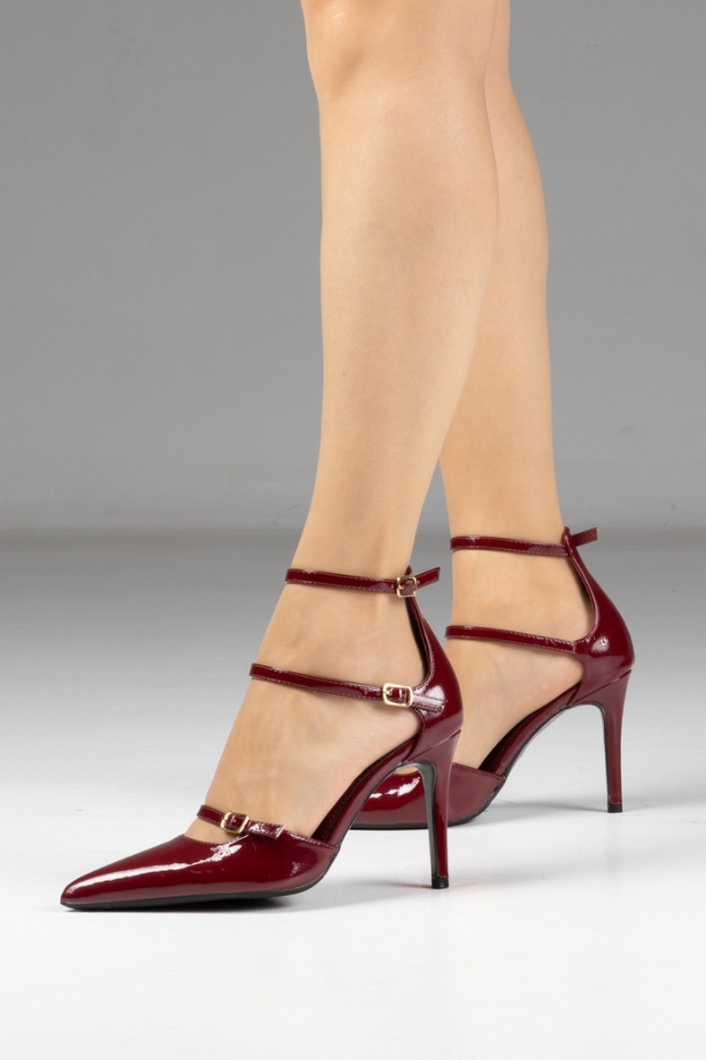 Γόβα λουστρίνι με λεπτό τακούνι, μυτερή με λεπτά λουράκια – Μπορντό