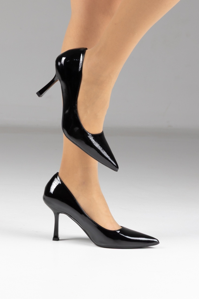 Γόβα λουστρίνι μυτερή με λεπτό τακούνι – Μαύρο