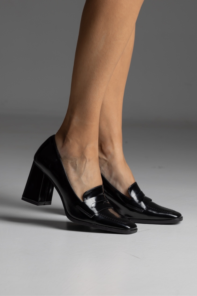 Γόβα λουστρίνι με χοντρό τακούνι .