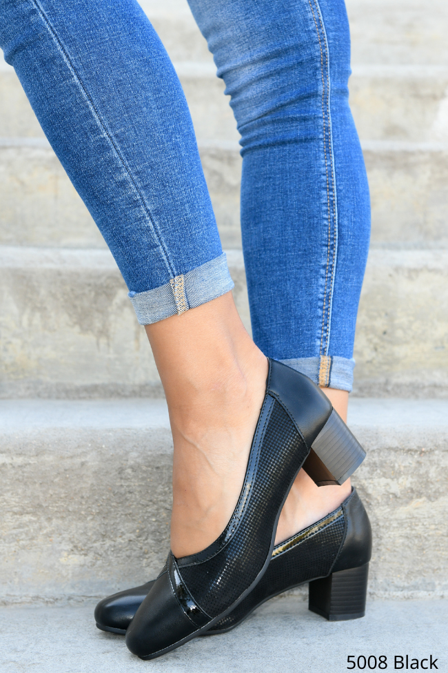 Γυναικεία γοβάκια με τετράγωνο χαμηλό τακούνι 5 εκ. και συνδυασμό υλικών συνθετικό δέρμα και λουστρίνι με πολύ άνετη εφαρμογή και μαλακό πάτο.