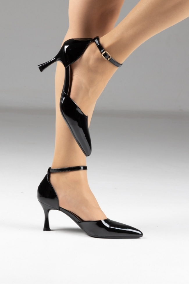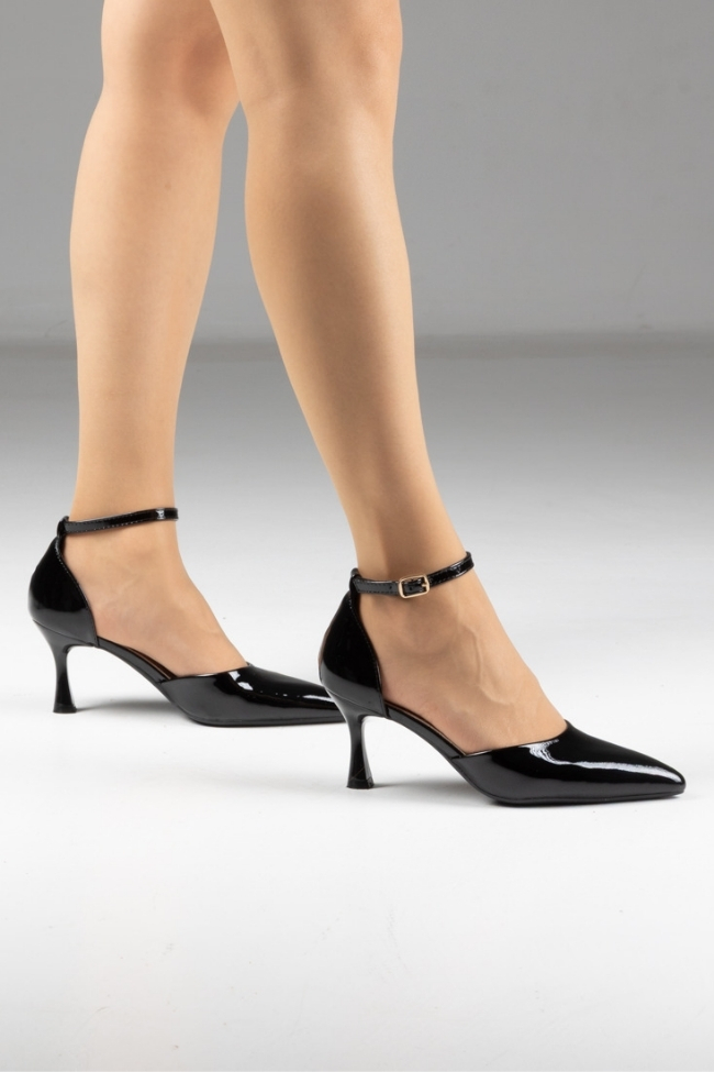 Γόβα λουστρίνι σε μαύρο χρώμα με λεπτό τακούνι ,μυτερή με μπαρέτα στον αστράγαλο.