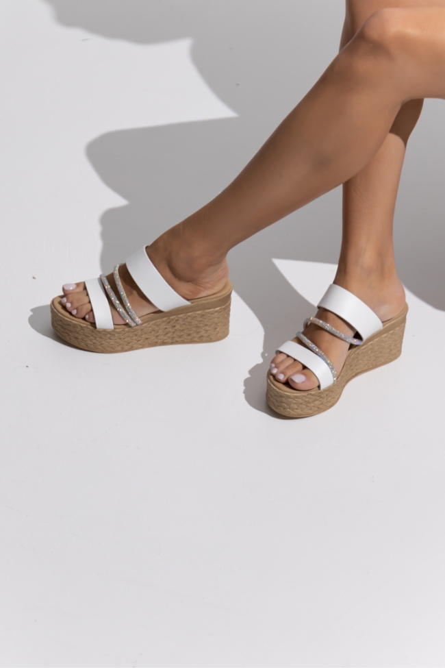 Δερμάτινες (LEATHER) Ελληνικές Πλατφόρμες παντόφλες με διπλό λουράκι strass – Λευκό