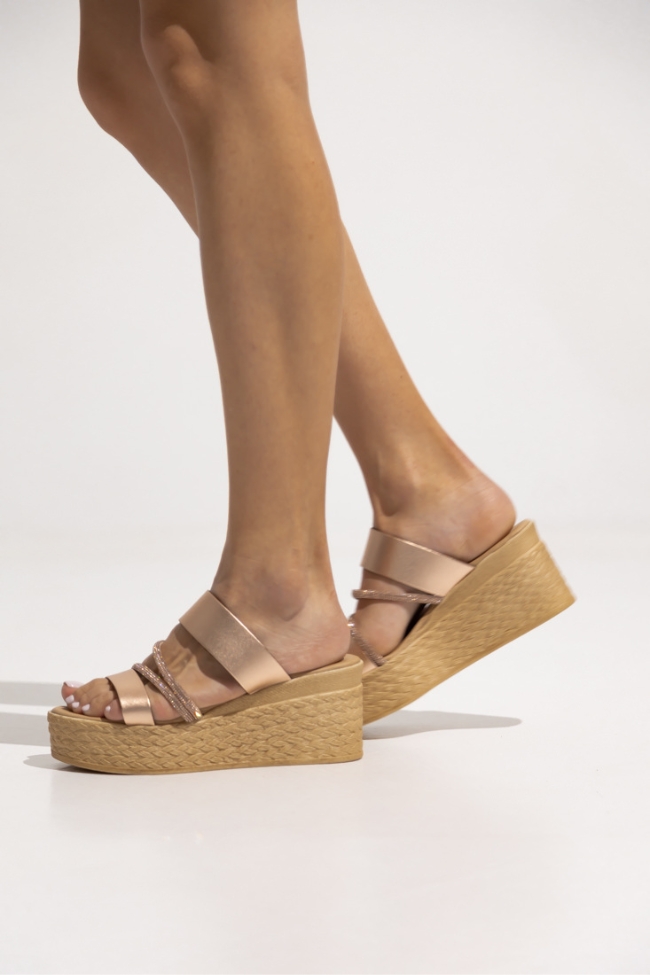 Δερμάτινες (LEATHER) Ελληνικές Πλατφόρμες παντόφλες με διπλό λουράκι strass – Σαμπανί