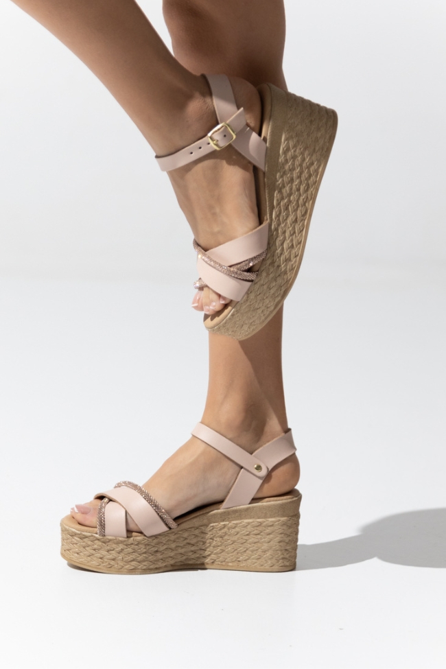 Δερμάτινες (LEATHER) Ελληνικές Πλατφόρμες με χιαστί λουράκια strass – Μπέζ