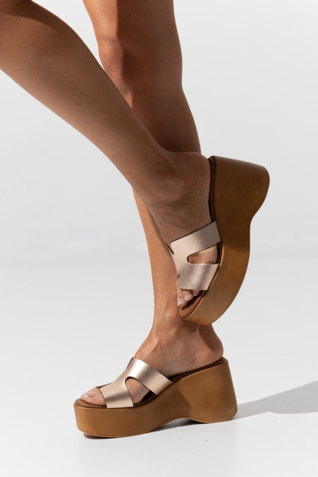 Δερμάτινες (LEATHER) Ελληνικές Πλατφόρμες με φαρδύ λουράκι ‘H’ στα δάχτυλα – Σαμπανί