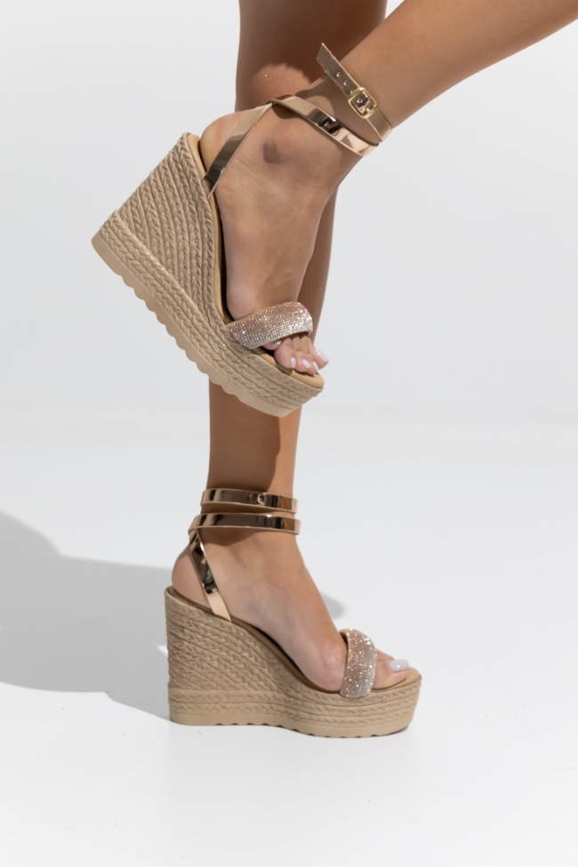 Δερμάτινες (LEATHER) Ελληνικές Πλατφόρμες με χοντρό λουράκι strass στα δάχτυλα – Σαμπανί