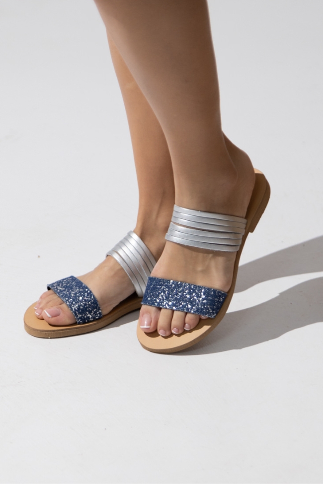 Δερμάτινες (LEATHER) Σανδάλια Ελληνικής κατασκευής με λεπτά λουράκια στο κουτεπιέ και φαρδύ λουράκι στα δάχτυλα – Τζίν / Ασημί