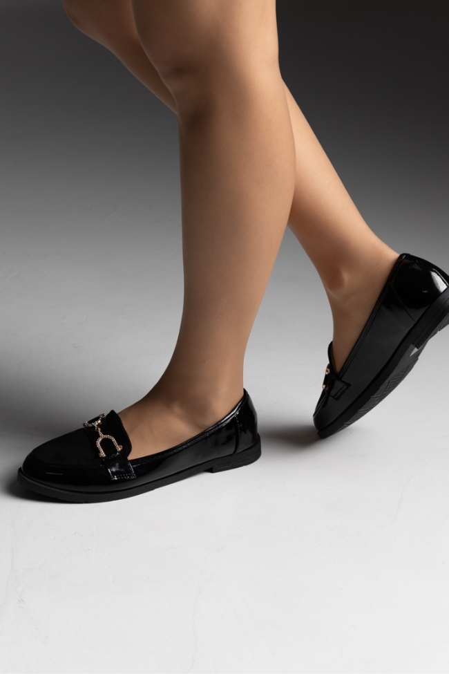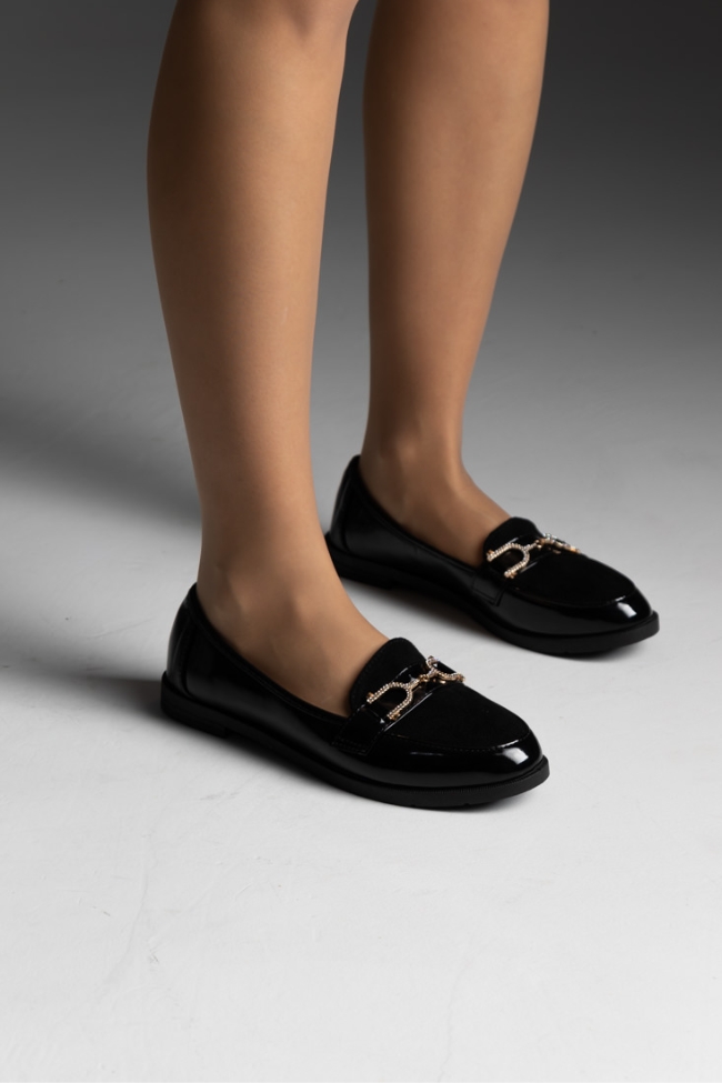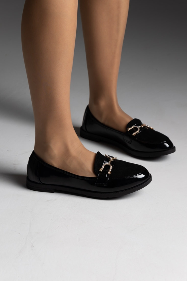 Μοκασίνια λουστρίνι με λεπτομέρεια suede και λουράκι με strass – Μαύρο