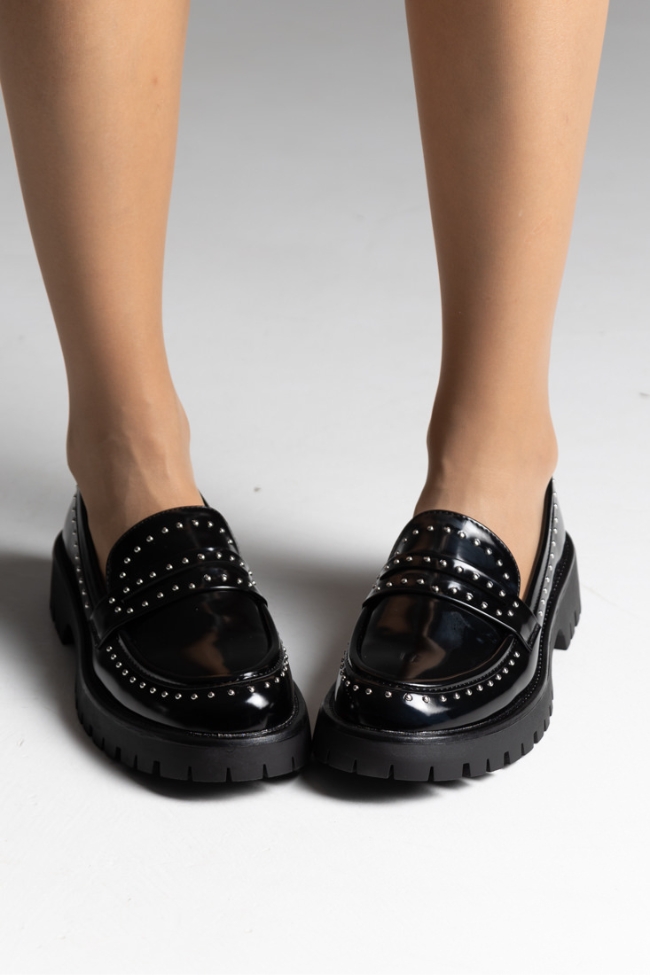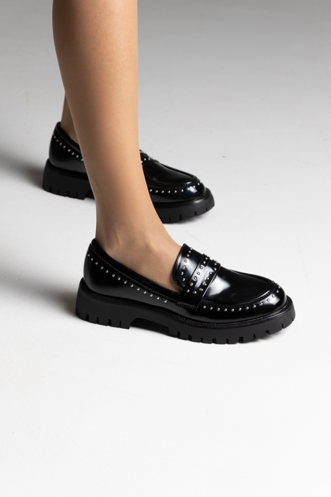 Γυναικεία chunky loafers σε χρώμα μαύρο,δερματίνη με διακοσμητικά τρουκς και τρακτερωτό πάτο.Ανακαλύψτε το απόλυτο αξεσουάρ που ενισχύει κάθε σας εμφάνιση! Διαθέτει μοναδικό σχεδιασμό με εντυπωσιακή αγκράφα και μοντέρνα τρακτερωτή σόλα για άνεση και στυλ. Ιδανικό για κάθε περίσταση, αυτό το must-have κομμάτι υπόσχεται να τραβήξει όλα τα βλέμματα!