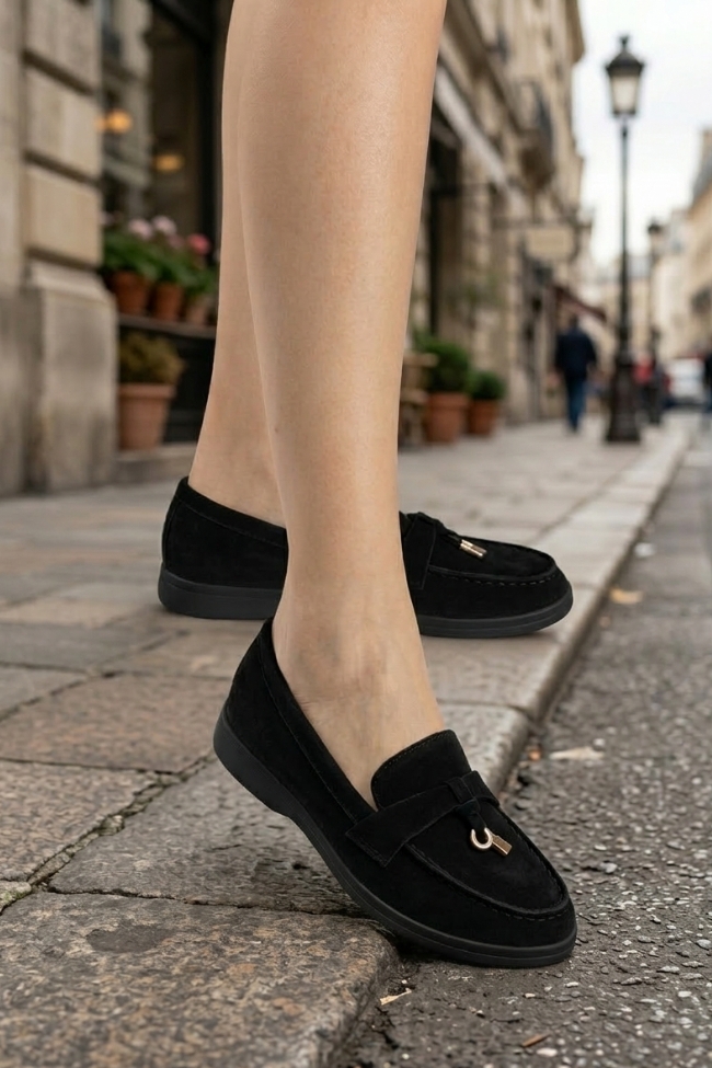 Γυναικεία μοκασίνια με διακοσμητική αγκράφα και ραφή περιμετρικά, κατασκευασμένα από suede ύφασμα υψηλής ποιότητας για κομψότητα και ανθεκτικότητα. Η αντιολισθητική σόλα από καουτσούκ προσφέρει σταθερό πάτημα, ενώ η εσωτερική επένδυση με απαλή υφή εξασφαλίζει άνεση στην πολύωρη χρήση. Ο κλασικός σχεδιασμός εμπλουτίζεται με μεταλλική λεπτομέρεια, αναδεικνύοντας τη διαχρονικότητα του μοντέλου. Συνδύασέ τα με cropped παντελόνι και πουκάμισο για smart casual εμφανίσεις ή με τζιν και πλεκτό για καθημερινό look. Ταιριάζουν επίσης με midi φούστες για πιο θηλυκό αποτέλεσμα.