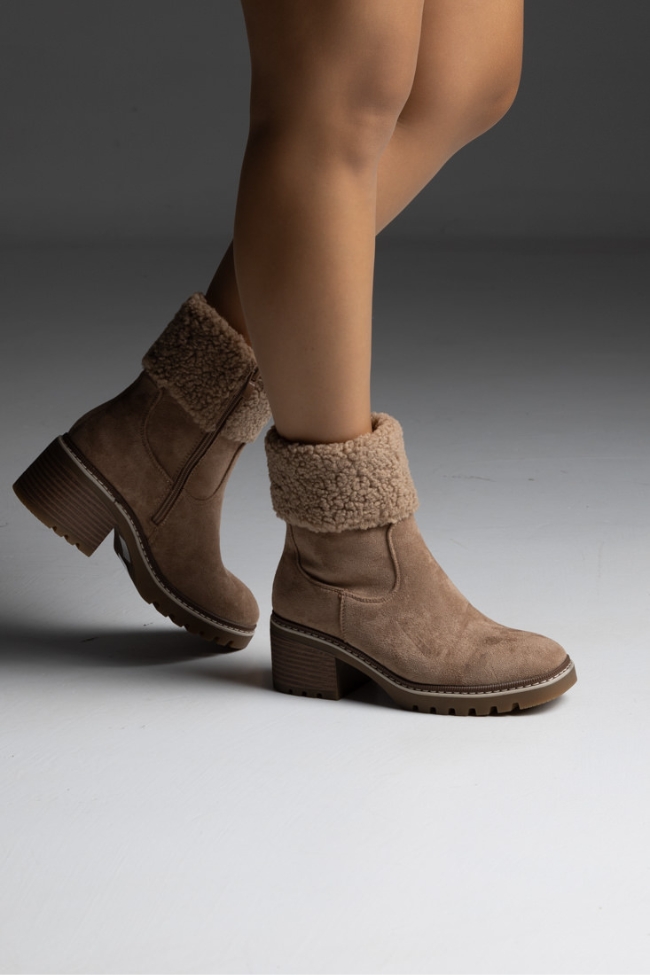 Μποτάκια γυναικεία με χοντρό τακούνι και γούνα στο πάνω μέρος – Σκούρο Μπέζ