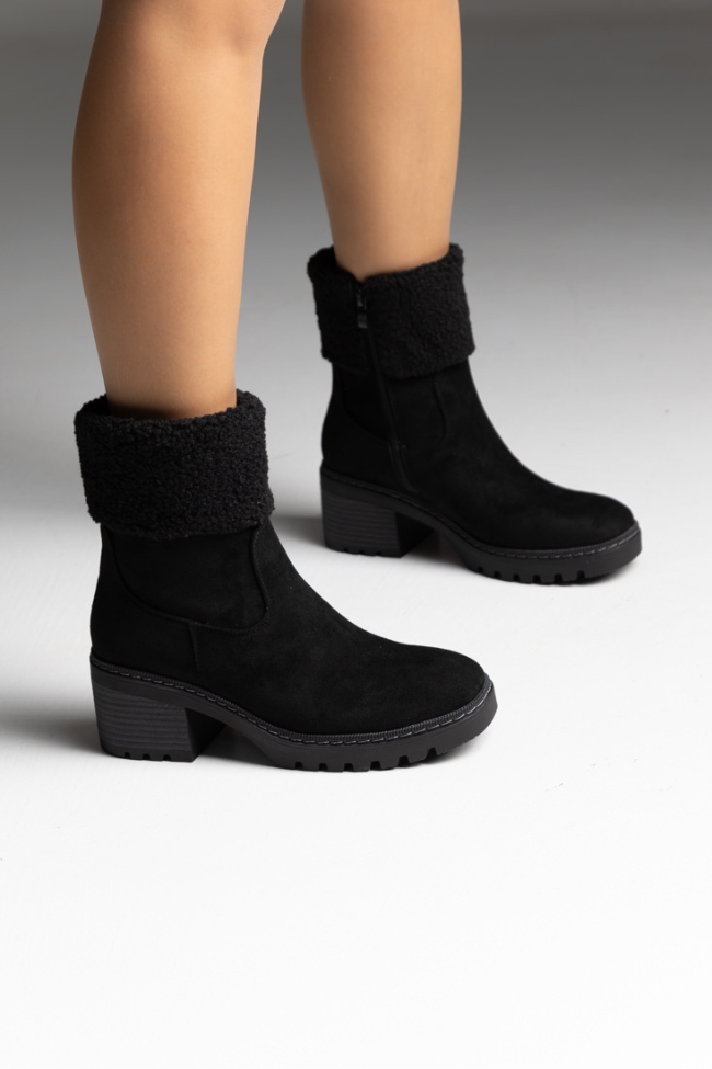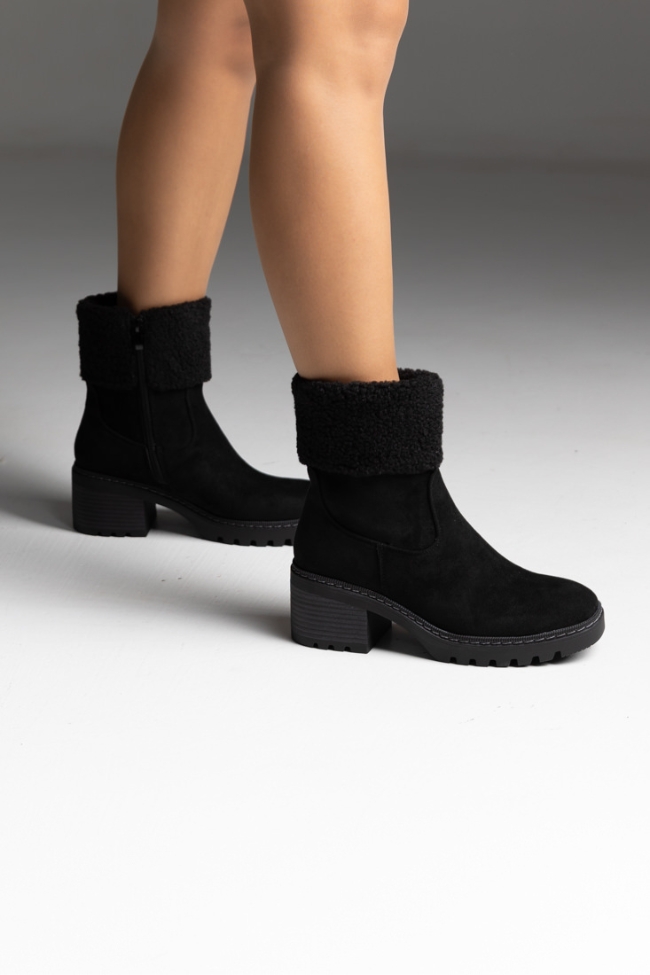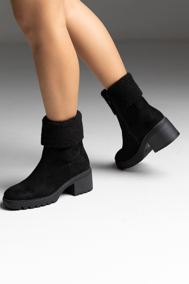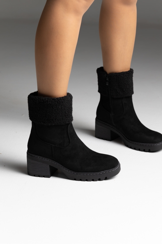 Μποτάκια γυναικεία με χοντρό τακούνι και γούνα στο πάνω μέρος – Μαύρο
