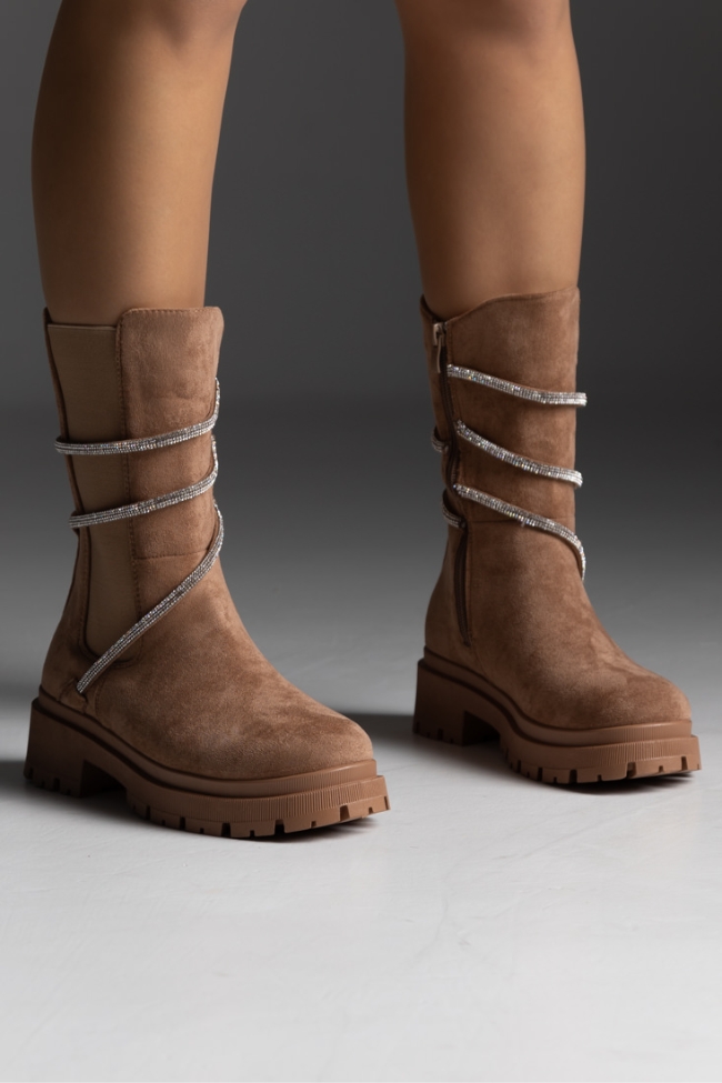 Μποτάκια suede με λουράκι strass – Κάμελ