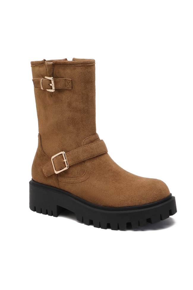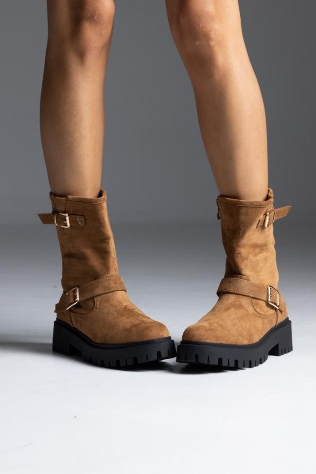 Μποτάκι suede με αγκράφες – Κάμελ