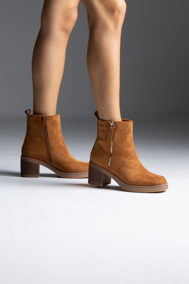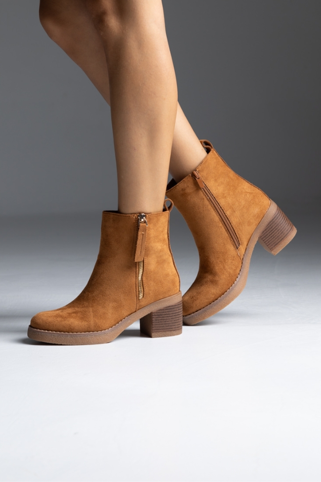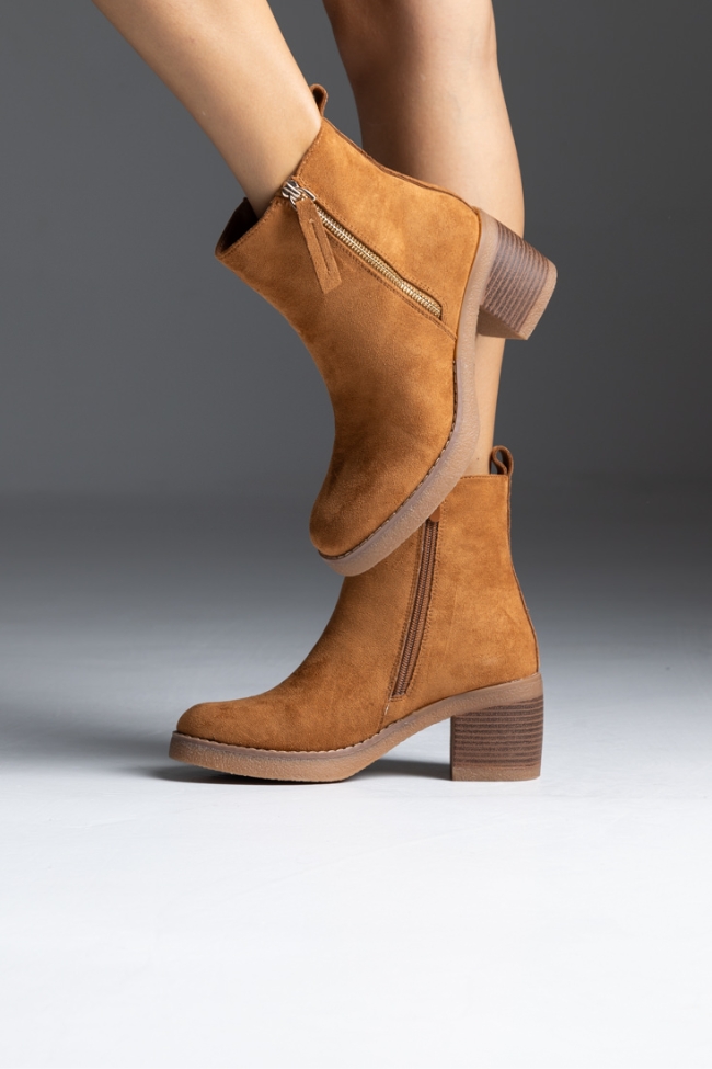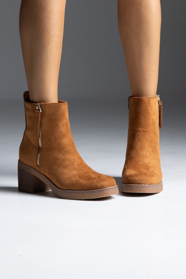 Μποτάκι suede με φερμουάρ,και χοντρό τακούνι κρέπ – Κάμελ