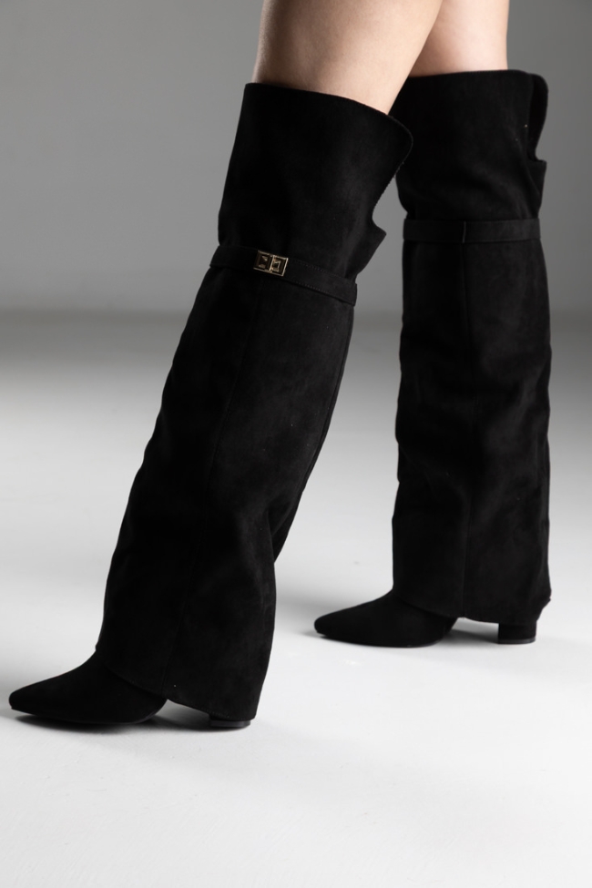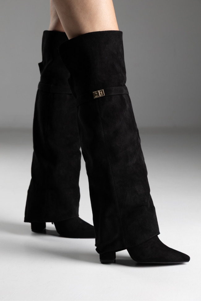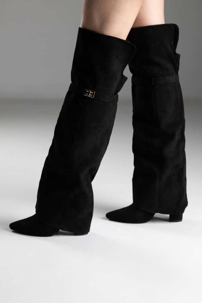 Μποτα over the Knee με αναδιπλωμένο ύφασμα και διακοσμητικό λουράκι – Μαύρο