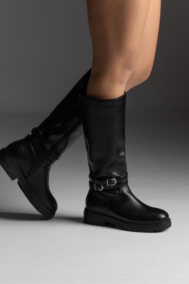Μπότα δερματίνη με διακοσμητική αγκράφα – Μαύρο
