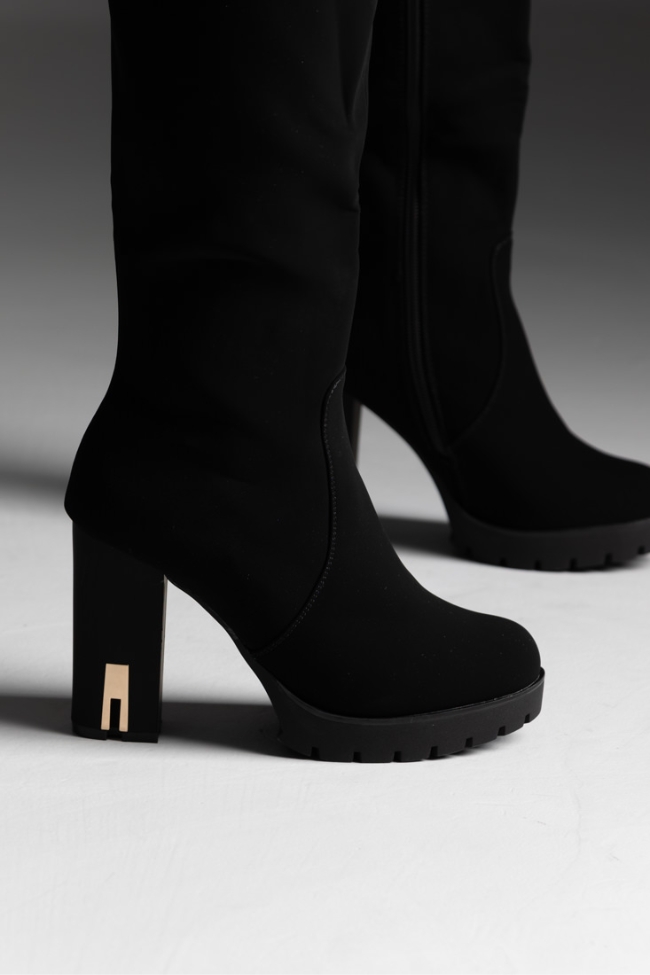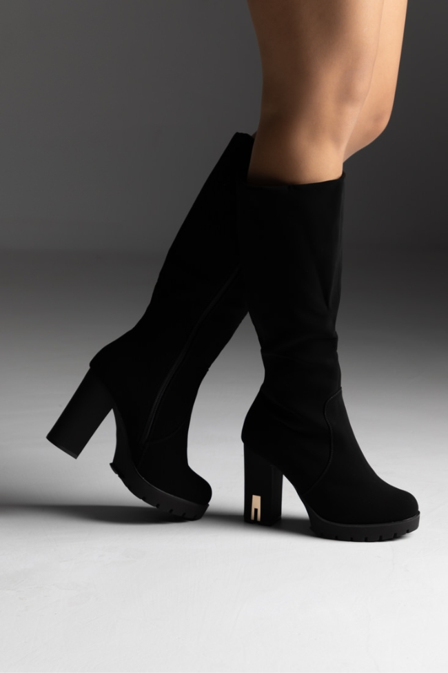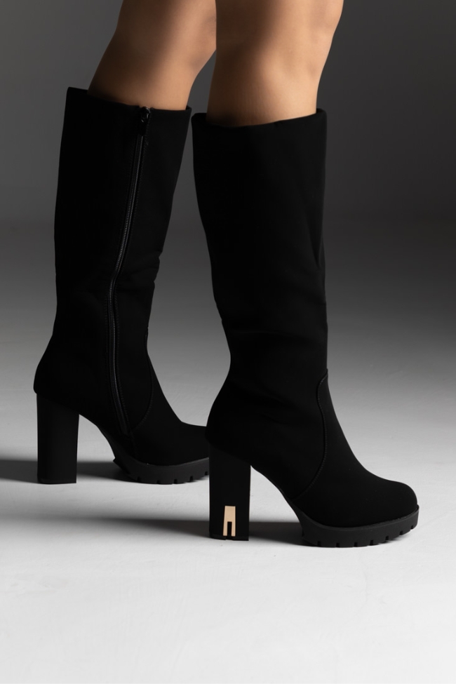 Μπότα ύφασμα suede με χοντρό τακούνι και μεταλλικό στοιχείο – Μαύρο