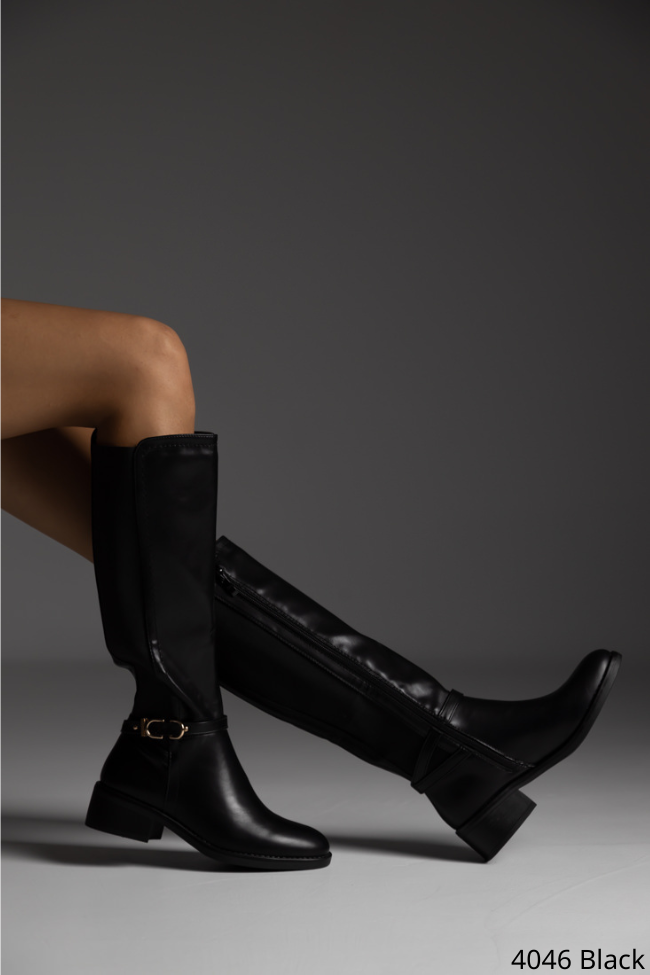 Μπότα δερματίνη με φερμουάρ εσωτερικά λάστιχο στο πίσω μέρος και διακοσμητικό λουράκι με χρυσή λεπτομέρεια.
