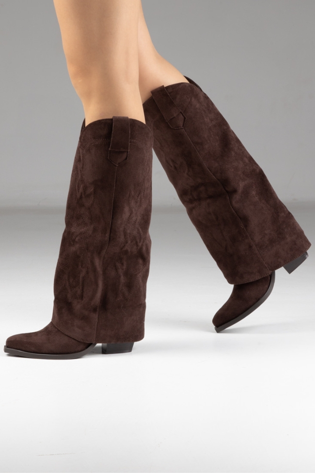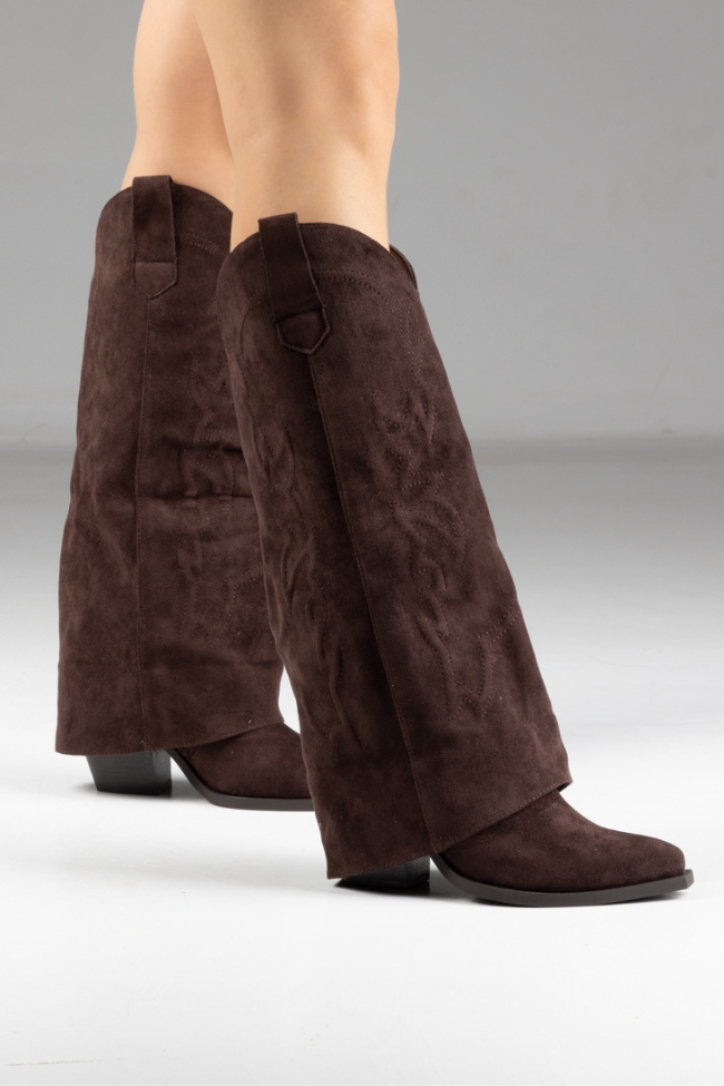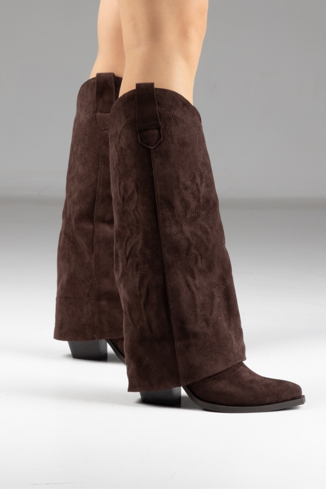 Μπότα suede με χοντρό τακούνι cow boy και ανάγλυφα σχέδια με αναδιπλωμένο ύφασμα.