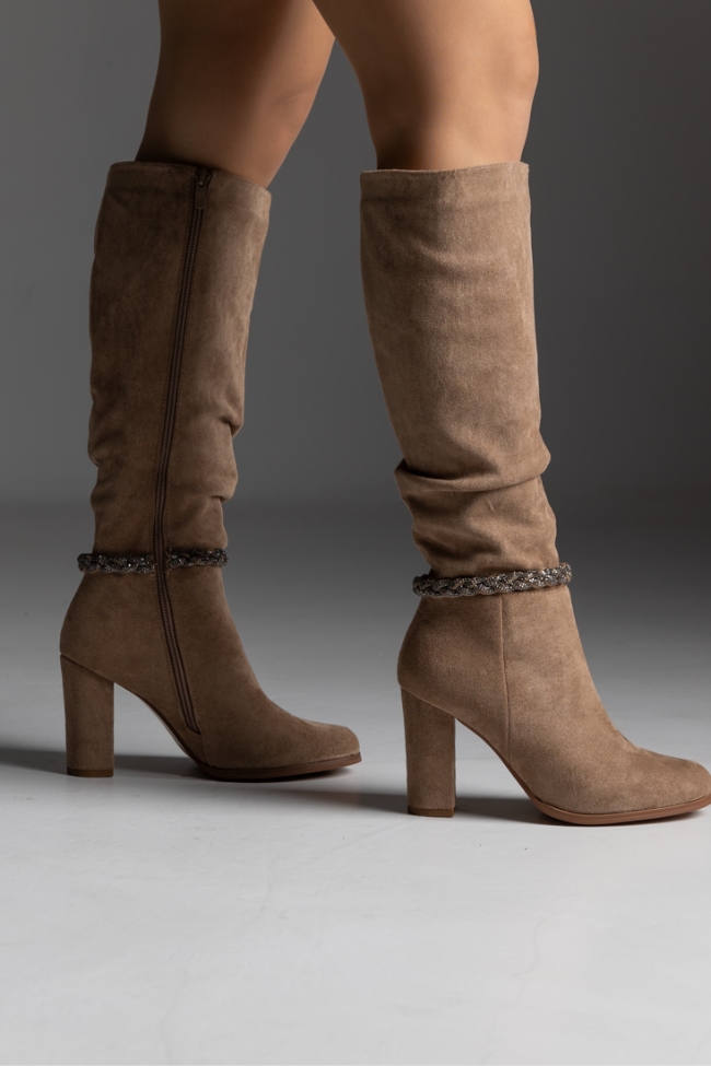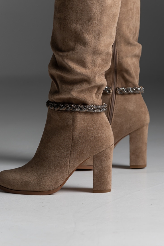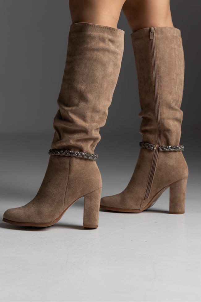 Μπότα suede με χοντρό τακούνι και διακοσμητικό λουράκι strass – Σκούρο Μπέζ