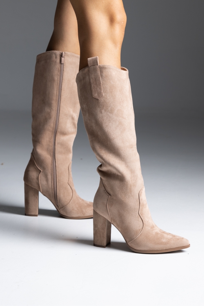 Μπότα suede με χοντρό τακούνι μυτερή – Μπέζ