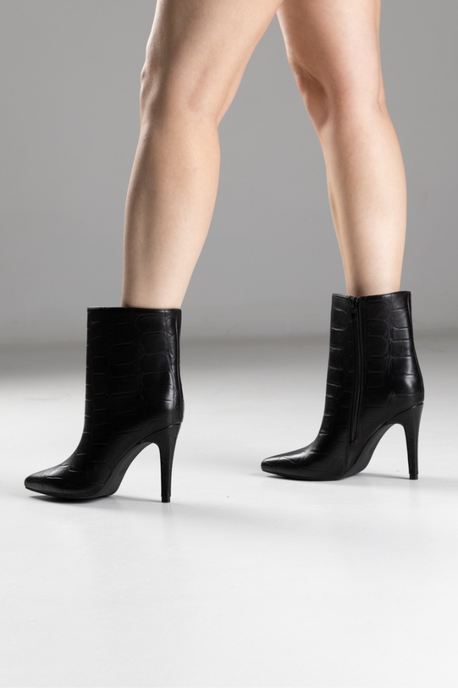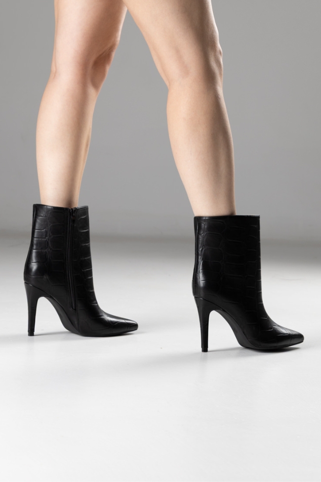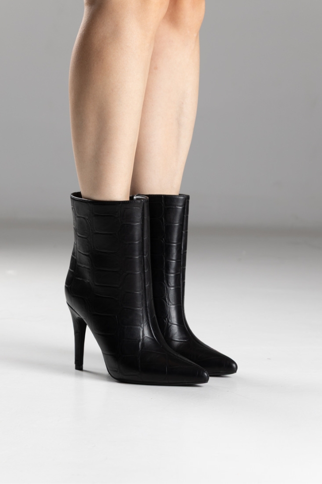 Μυτερά μποτάκια με υφή croc-effect, ψηλό τακούνι στιλέτο και πλαϊνό φερμουάρ. Κομψός σχεδιασμός για εκλεπτυσμένες εμφανίσεις από το πρωί ως το βράδυ.