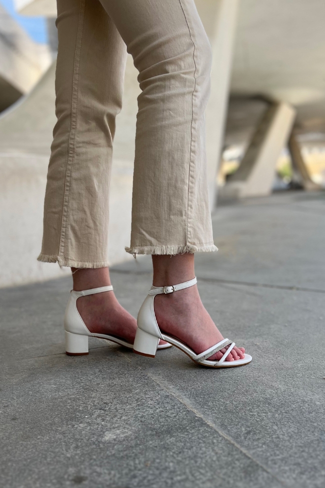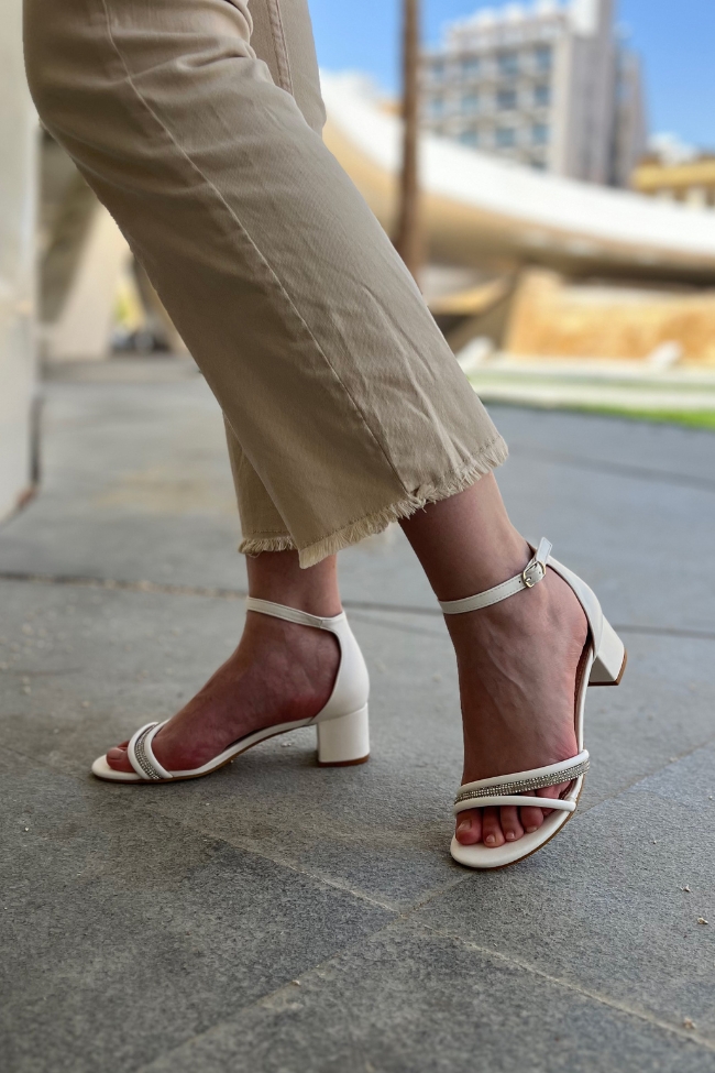 Πέδιλο δερματίνη με χοντρό χαμηλό τακούνι και λουράκια με στρας – Λευκό