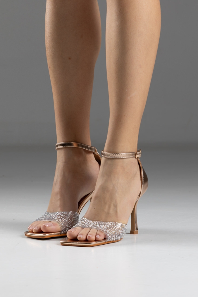 Πέδιλο με λεπτό τακούνι , διαφάνεια στα δάχτυλα με strass και πέρλες – Σιαμπανί