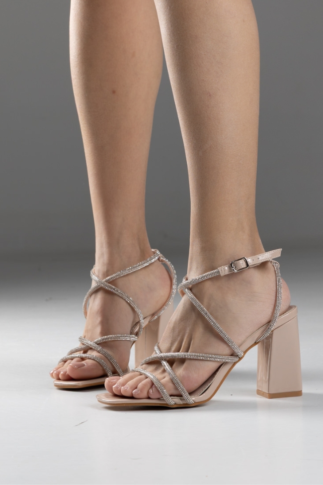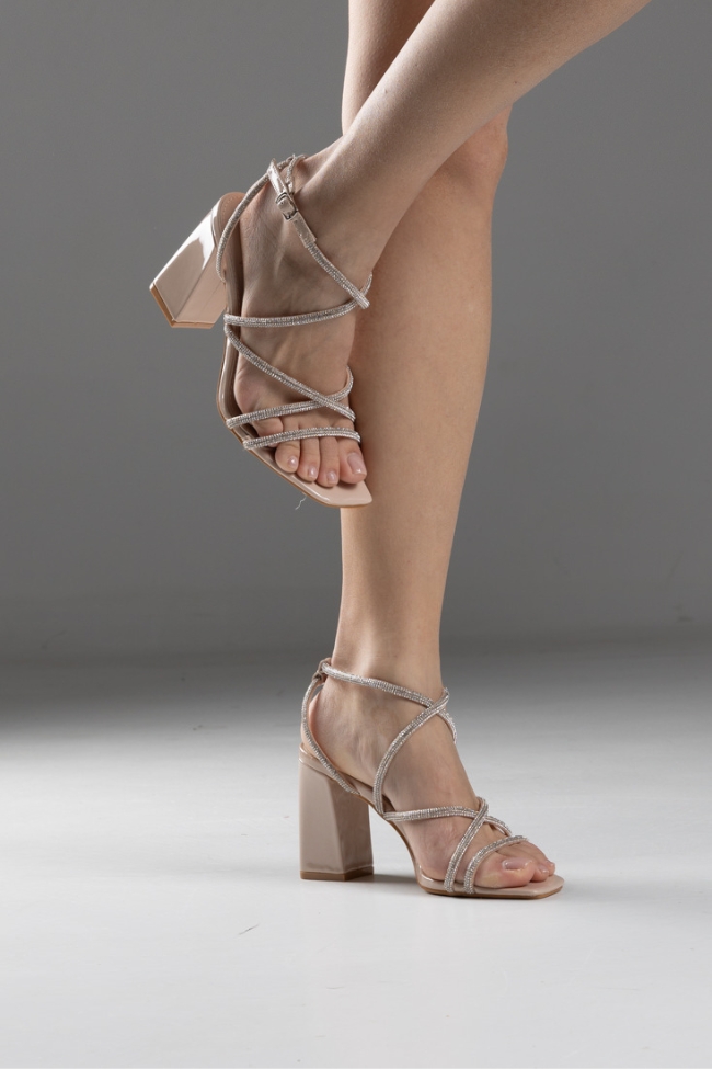 Πέδιλο με χοντρό τακούνι , λουστρίνι με λεπτά λουράκια με strass – Μπέζ