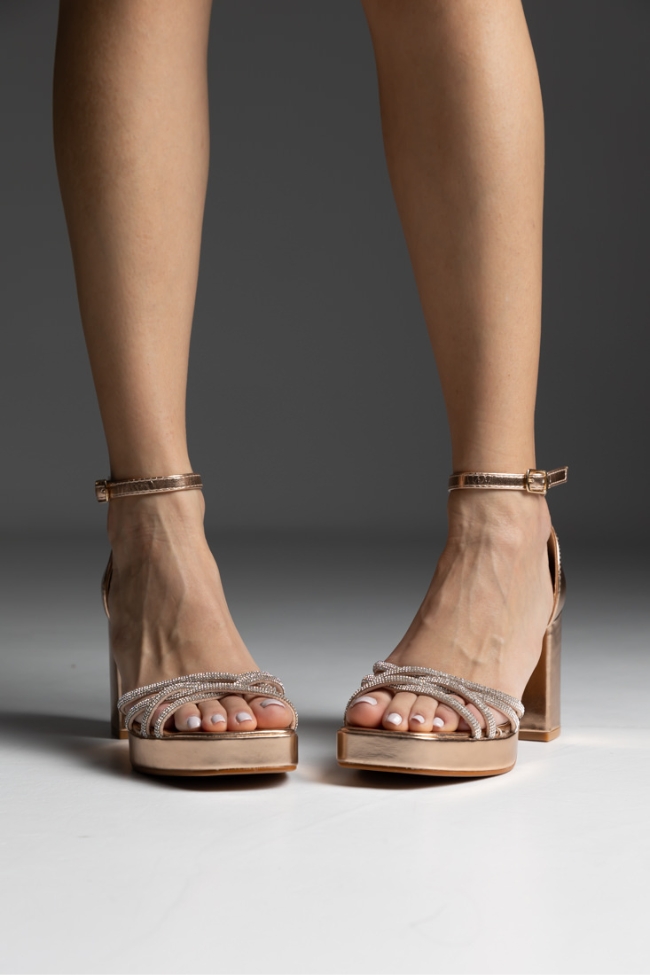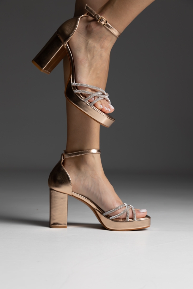 Πέδιλο δερματίνη με χοντρό τακούνι και λουράκια strass στα δάχτυλα – Σαμπανί