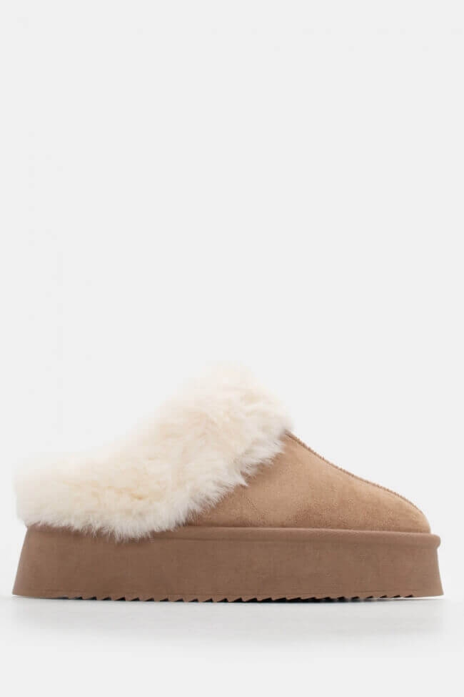 Παντόφλες με ψηλή σόλα και γούνα – Σκούρο Μπεζ