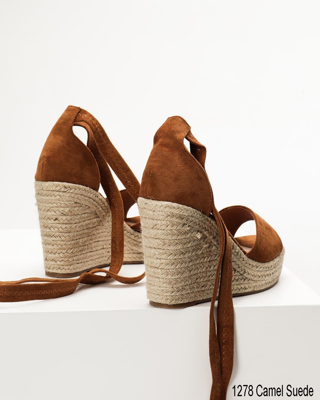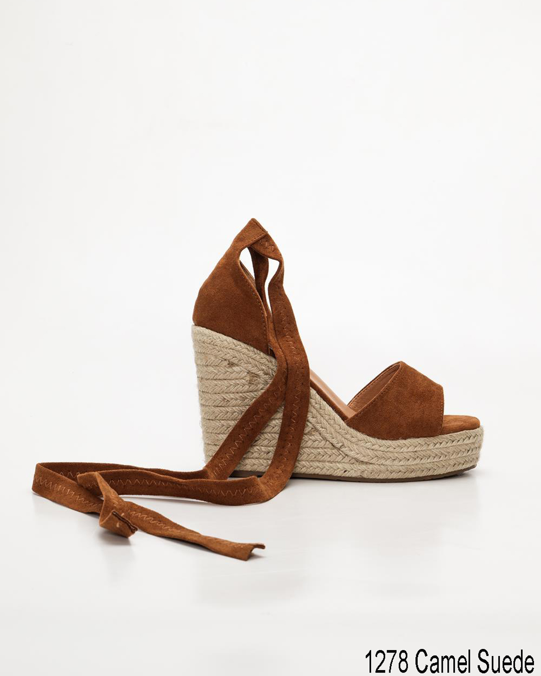 Πλατφόρμα Suede με ντυμένο τακούνι από σχοινί και άνοιγμα στο πλάι ,δένει στον αστράγαλο με κορδέλα – Κάμελ
