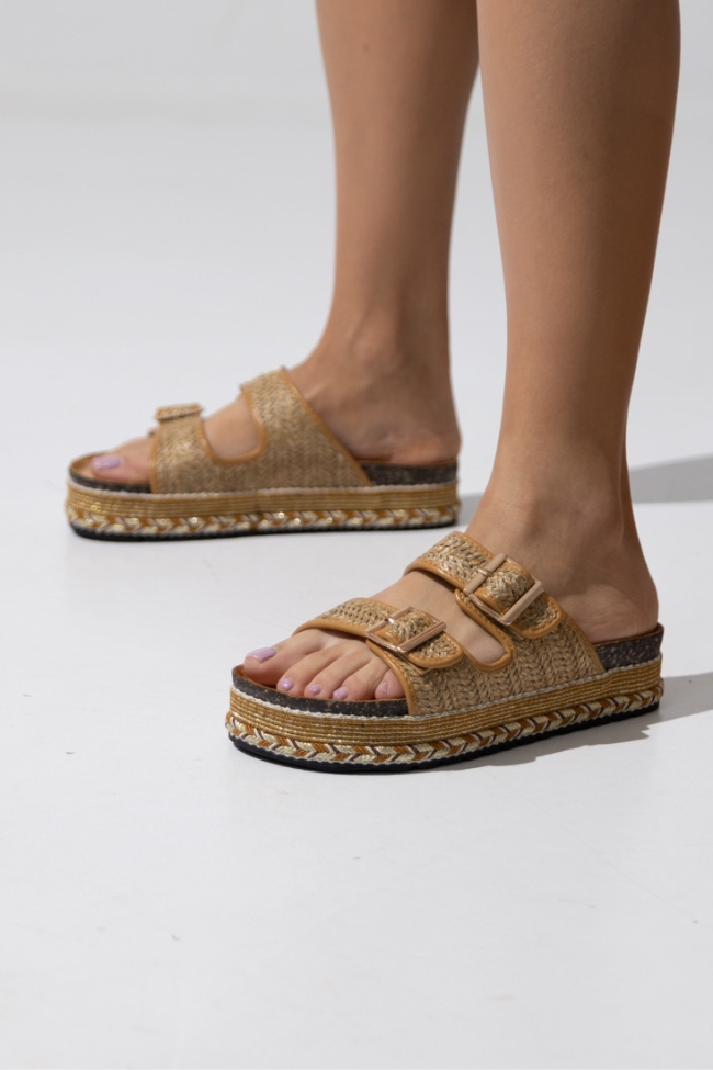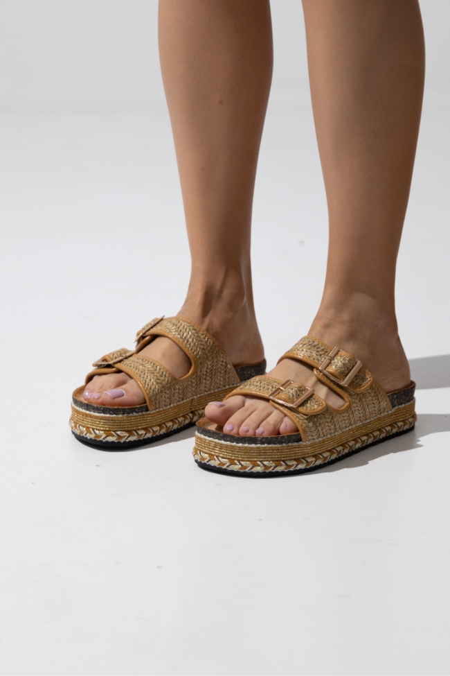 Σανδάλια Flatform με διπλή αγκράφα ψάθινο – Κάμελ