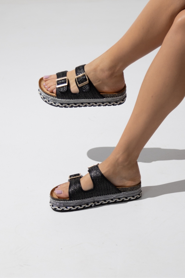 Σανδάλια Flatform με διπλή αγκράφα ψάθινο – Μαύρο