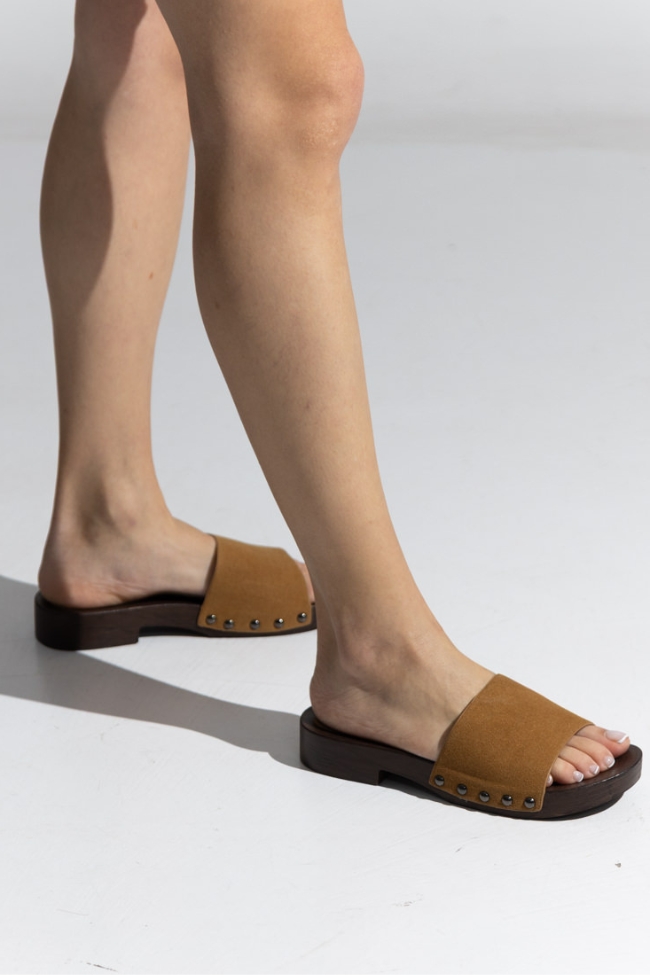 Γυναικεία τσόκαρα από σουέτ υφή, με φαρδιά ενιαία λωρίδα στο επάνω μέρος και βάση με περιμετρικά μεταλλικά καρφιά, σχεδιασμένα με ανοιχτή μύτη και χαμηλό τακούνι. Το επάνω μέρος έχει λεία ματ επιφάνεια με καθαρές γραμμές κοπής και εσωτερική επένδυση που προσαρμόζεται ομοιόμορφα στο πέλμα. Η βάση αποδίδεται σε όψη ξύλου με συμπαγή δομή, ελαφριά ανύψωση στη φτέρνα και σταθερή γραμμή στο μπροστινό μέρος. Τα μεταλλικά στοιχεία ενσωματώνονται συμμετρικά στην ένωση των υλικών, ενισχύοντας τη σταθερότητα. Ο πάτος είναι λείος με ομοιόμορφη έδραση, ενώ η εξωτερική σόλα διαθέτει αντιολισθητική υφή για ασφαλή επαφή με το έδαφος. Η μπεζ απόχρωση φωτίζει το σχέδιο και αναδεικνύει τη λιτή δομή του. Κατάλληλα για σύνολα με φυσικούς τόνους, λινά παντελόνια και midi φούστες.