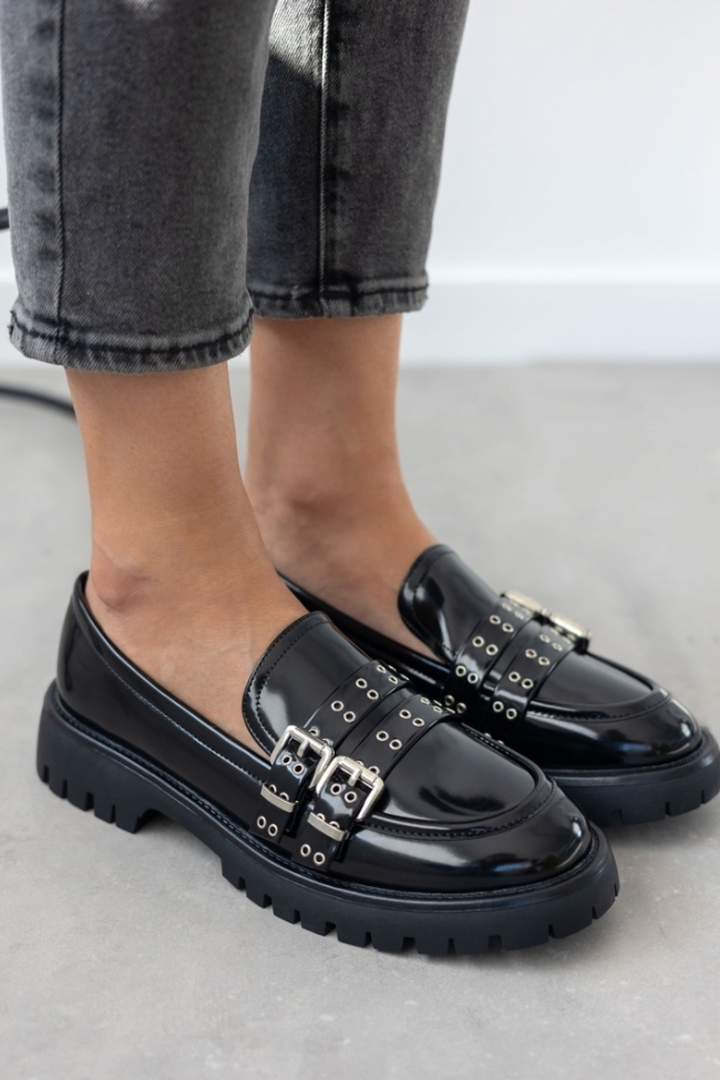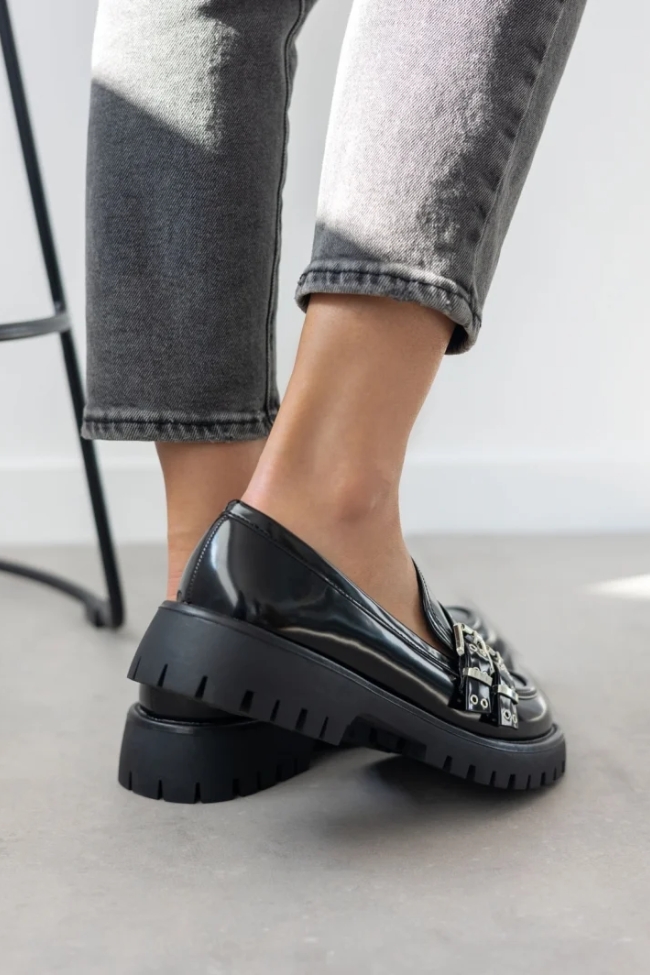Chunky loafers δερματίνη με διπλό λουράκι με τρουκς στο πάνω μέρος και τρακτερωτό πάτο .Αναδείξτε το στυλ σας με αυτά τα εντυπωσιακά chunky loafers που συνδυάζουν το κλασικό design με μια μοντέρνα, τολμηρή πινελιά.   Aυτά τα loafers διαθέτουν μια χοντρή σόλα που προσφέρει άνεση και σταθερότητα σε κάθε βήμα. Οι διπλές μεταλλικές αγκράφες προσθέτουν έναν edgy χαρακτήρα, καθιστώντας αυτά τα loafers ιδανικά για καθημερινή χρήση αλλά και για πιο ξεχωριστές εμφανίσεις. Αν ψάχνετε για γυναικεία chunky loafers, μοντέρνα   παπούτσια ή loafers με αγκράφες, αυτά τα loafers είναι η τέλεια προσθήκη στη συλλογή σας. Αυτά τα chunky loafers είναι η απόλυτη επιλογή για να προσθέσετε ένταση και χαρακτήρα σε κάθε σας outfit. Συνδυάστε τα με ένα ψηλόμεσο παντελόνι και ένα oversized πουλόβερ για ένα μοντέρνο, urban look. Για πιο τολμηρές εμφανίσεις, φορέστε τα με ένα δερμάτινο μπουφάν και skinny jeans, δημιουργώντας ένα σύνολο που εκπέμπει αυτοπεποίθηση και στυλ. Ακόμη, αυτά τα loafers μπορούν να συνδυαστούν με ένα midi φόρεμα και statement αξεσουάρ για ένα σύγχρονο twist σε μια κλασική εμφάνιση. Όποιον συνδυασμό κι αν επιλέξετε, αυτά τα loafers θα αναβαθμίσουν το στυλ σας με έναν ξεχωριστό και δυναμικό