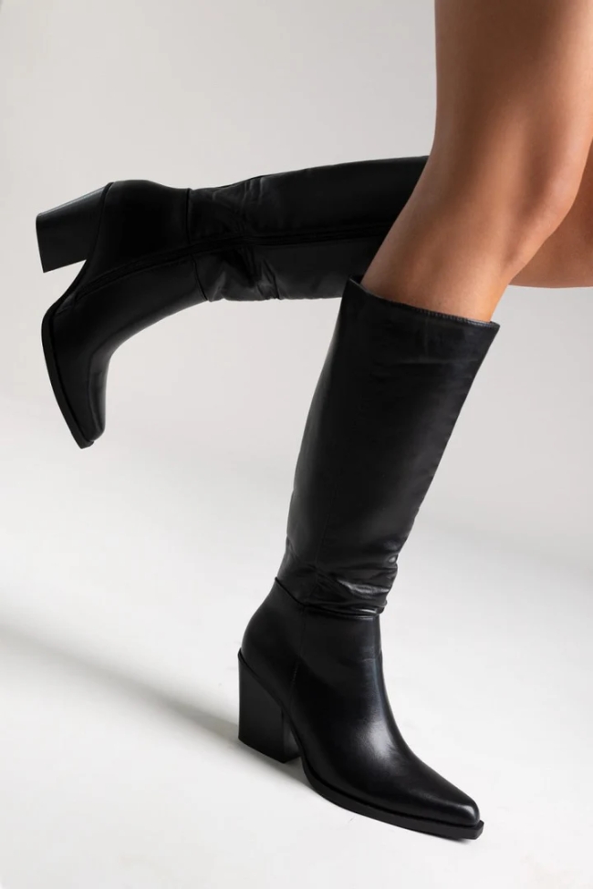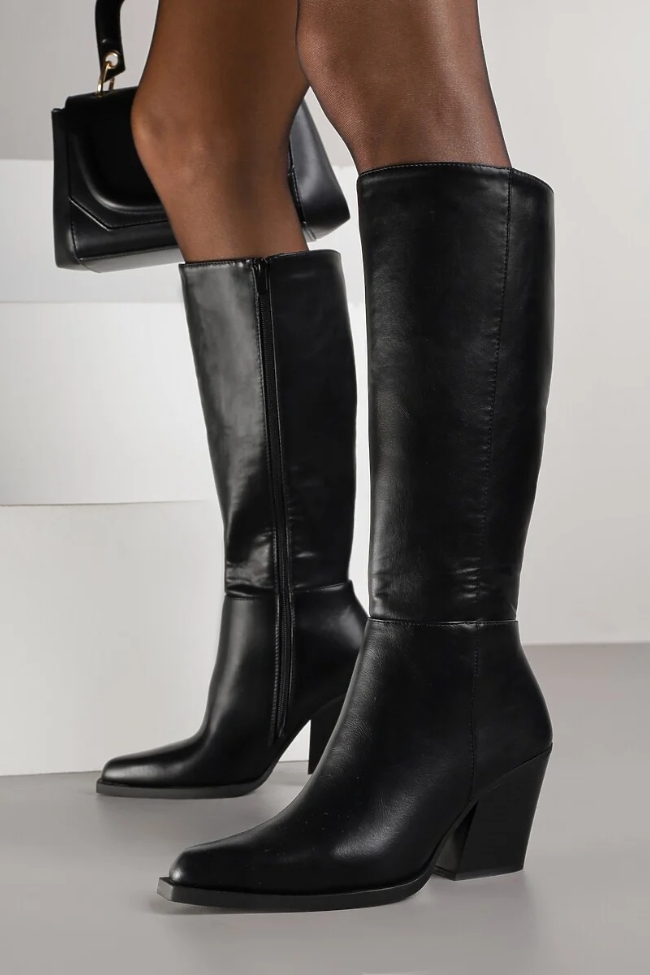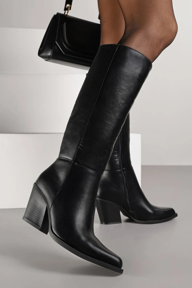 Κομψές cowboy μπότες με ψηλό block τακούνι, μυτερή μύτη και μαλακό πάτο. Μοντέρνο western στυλ με άνεση όλη μέρα.