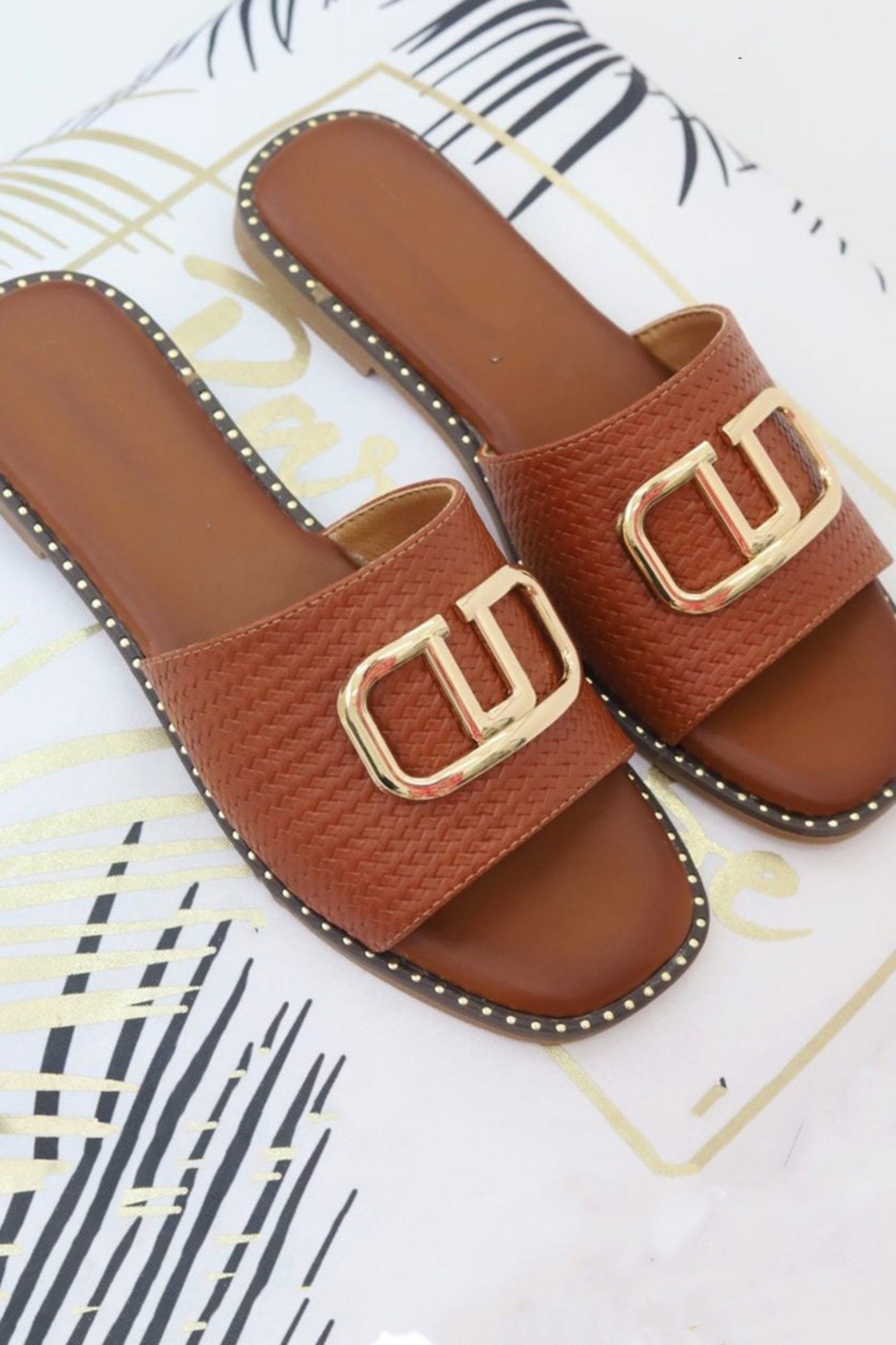 Παντόφλες Flat με χρυσή αγκράφα και σχέδιο ψάθας – Κάμελ