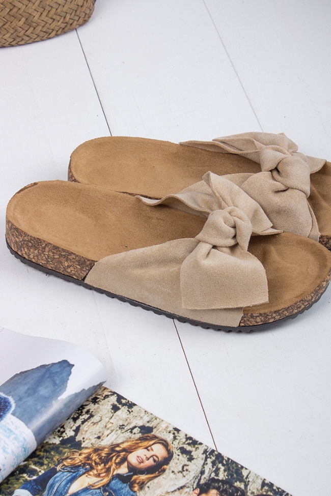 Παντόφλες Flatforms suede με φιόγκο – Μπέζ