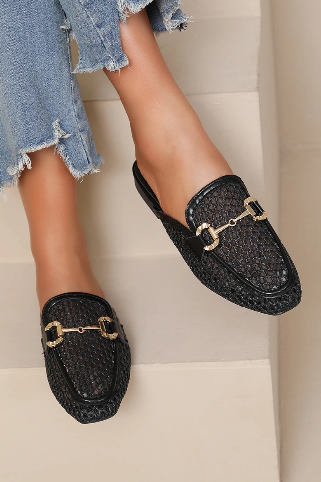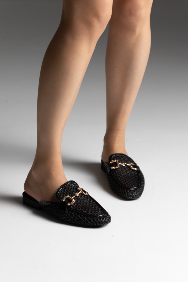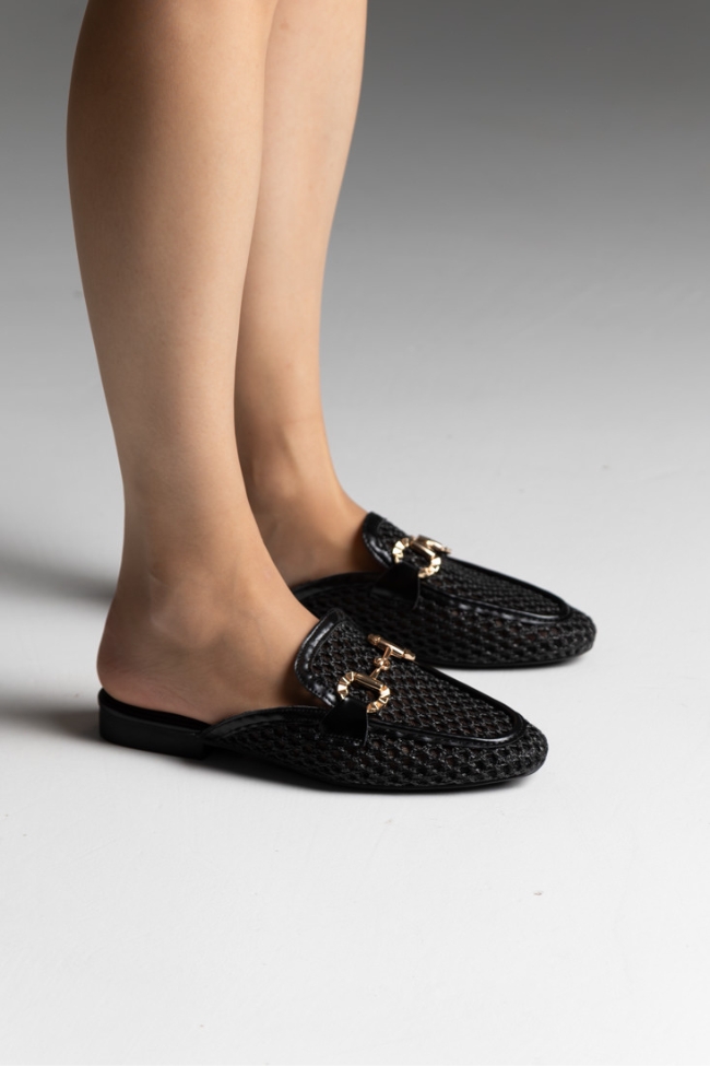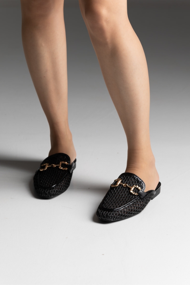 Mules loafers με ψάθινη πλέξη & μεταλική αγκράφα – Μαύρο