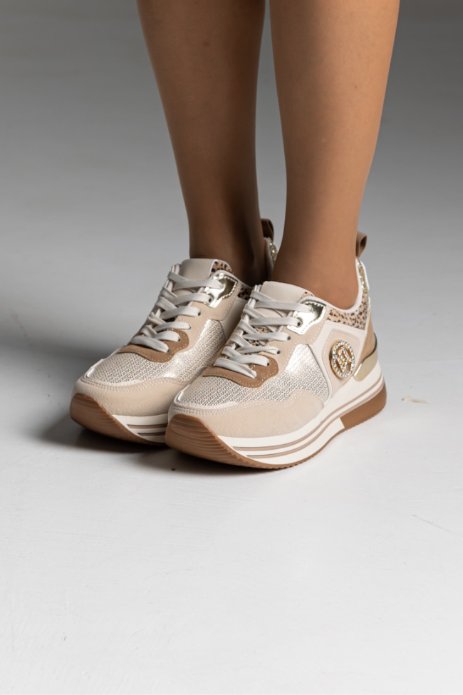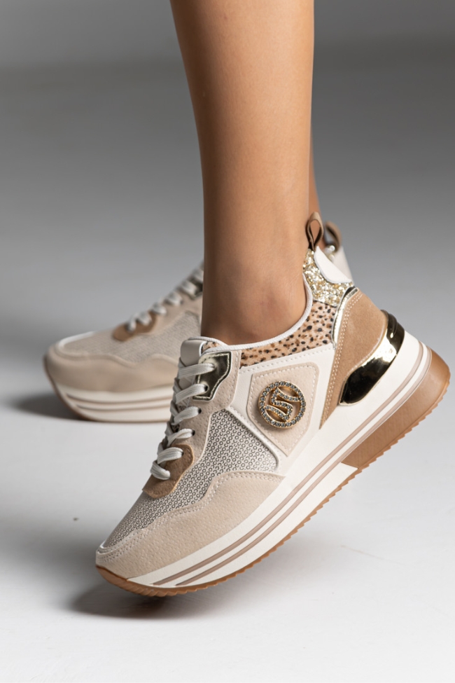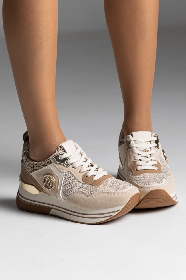 Sneakers Δίσολα με λεοπάρ λεπτομέρειες και διακοσμητικές πούλιες – Μπέζ