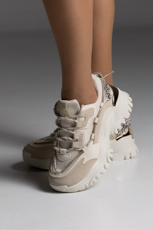 Sneakers δερματίνη με διακοσμητικά strass με συνδυασμό υφασμάτων – Μπέζ