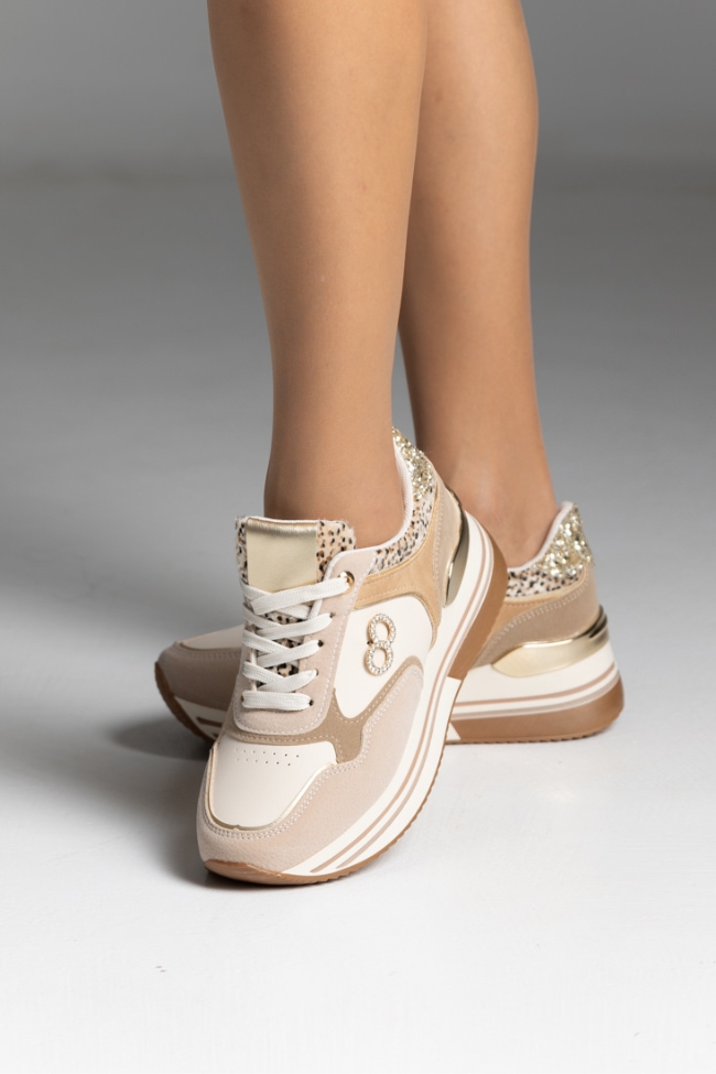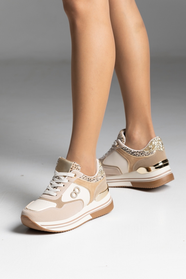 Sneakers δερματίνη με λεοπάρ λεπτομέρειες και διακοσμητικές πούλιες – Μπέζ
