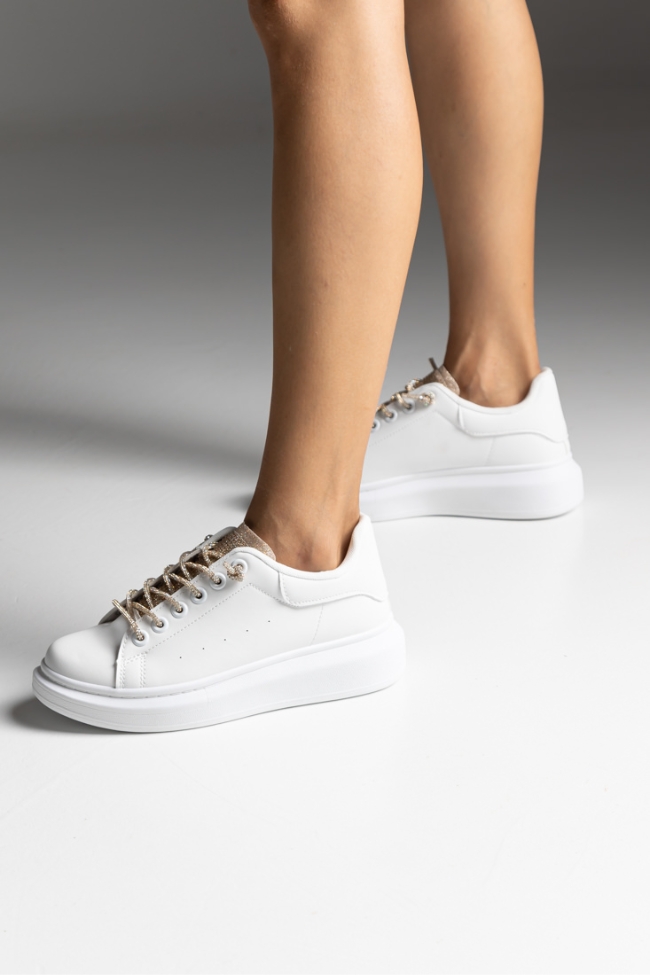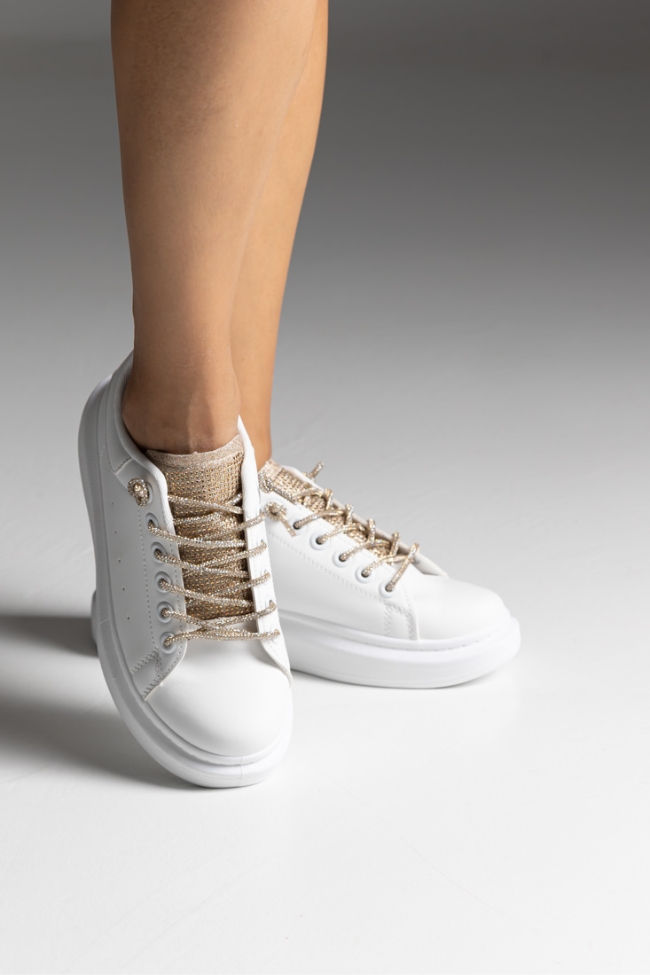 Sneakers δερματίνη με strass στη γλώσσα και ιδιαίτερα κορδόνια – Λευκό / Χρυσό