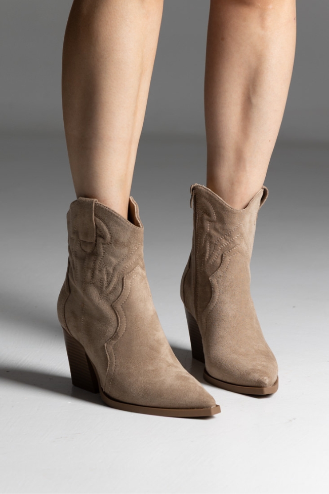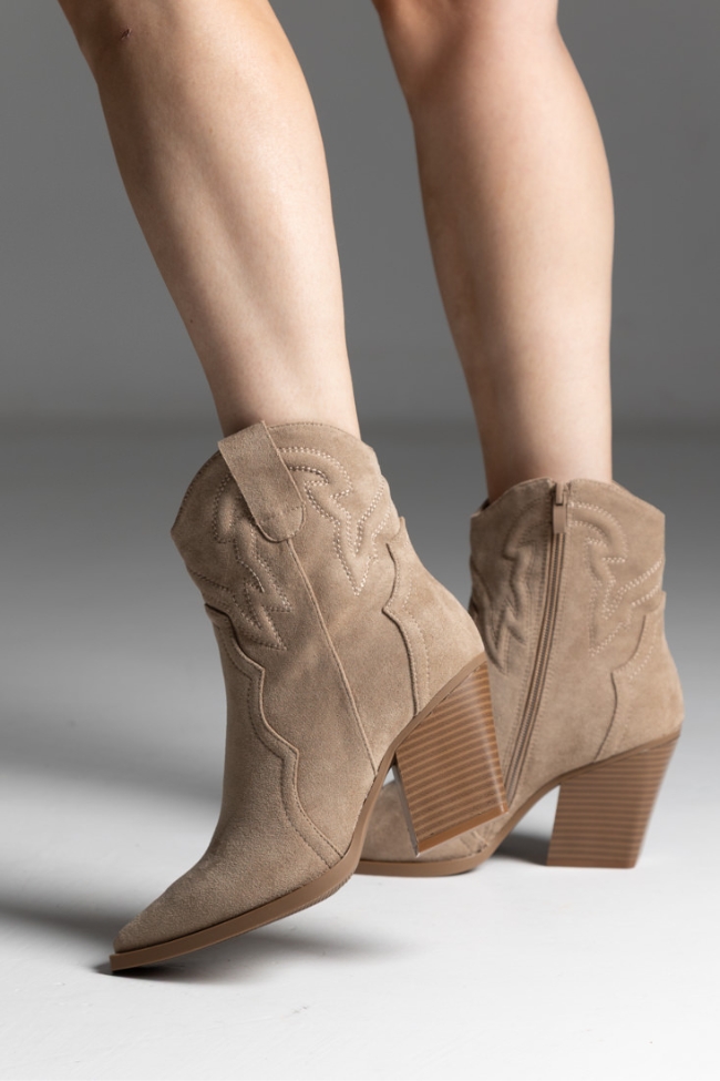 Western Μποτάκια Suede με Τακούνι- Σκούρο Μπεζ